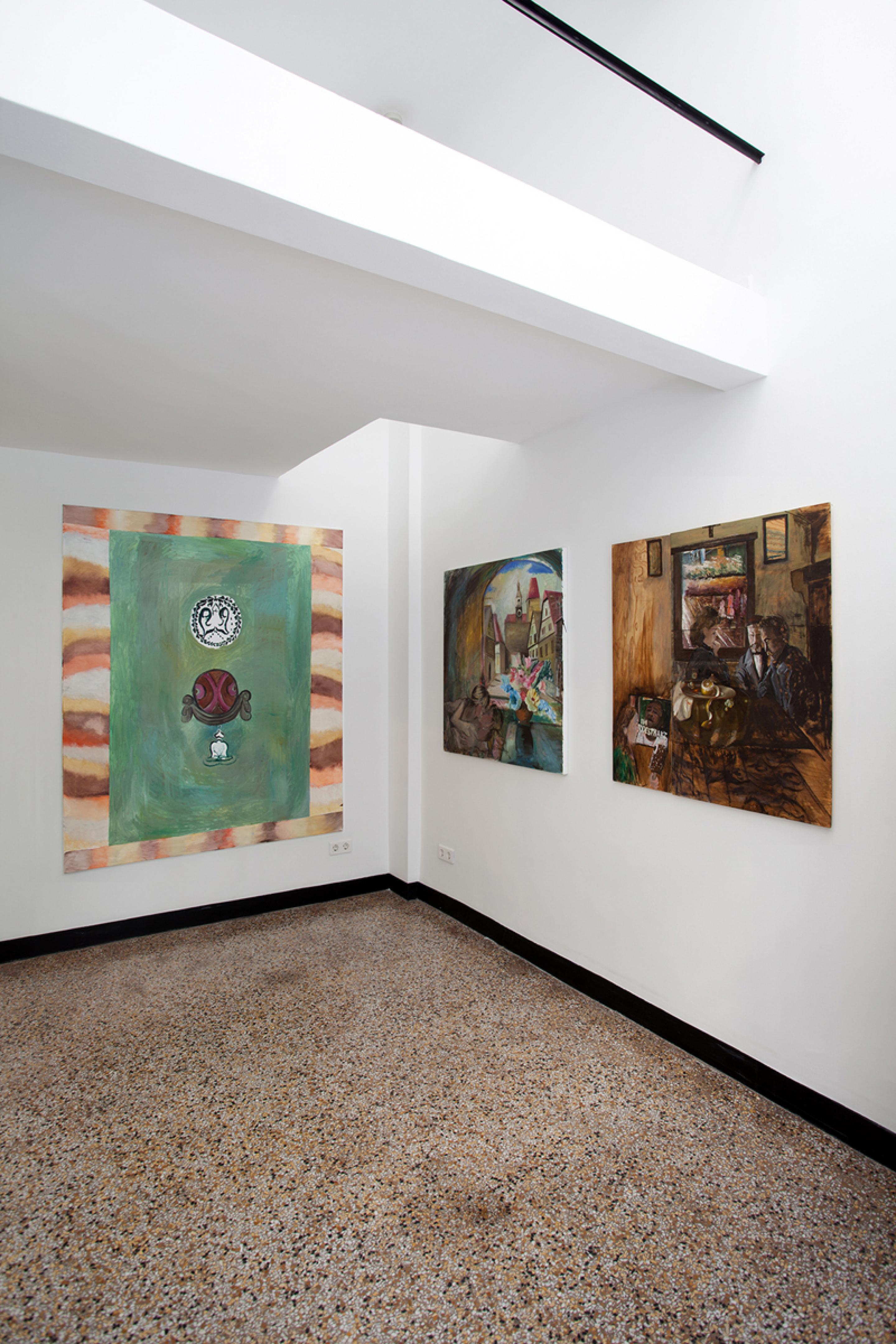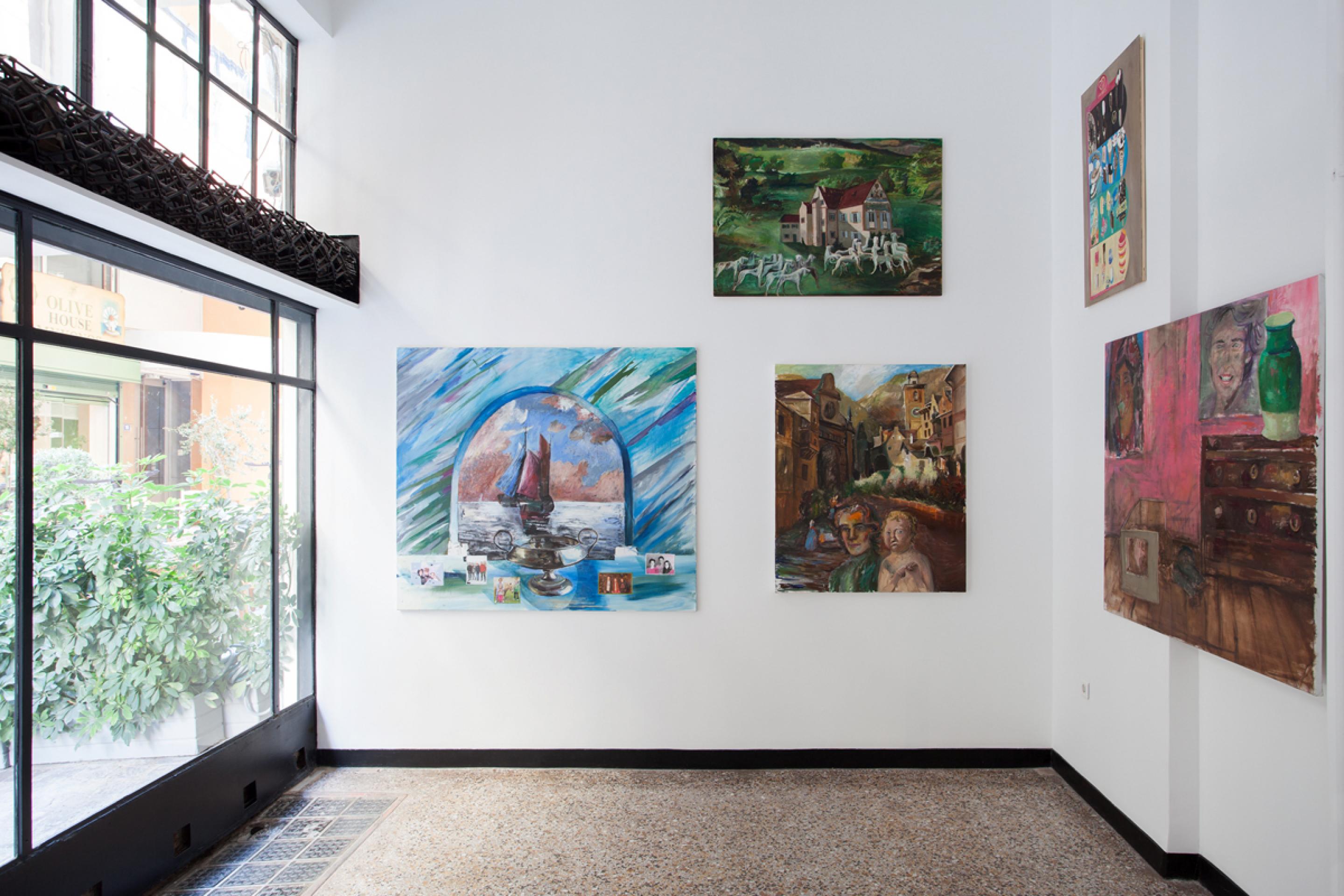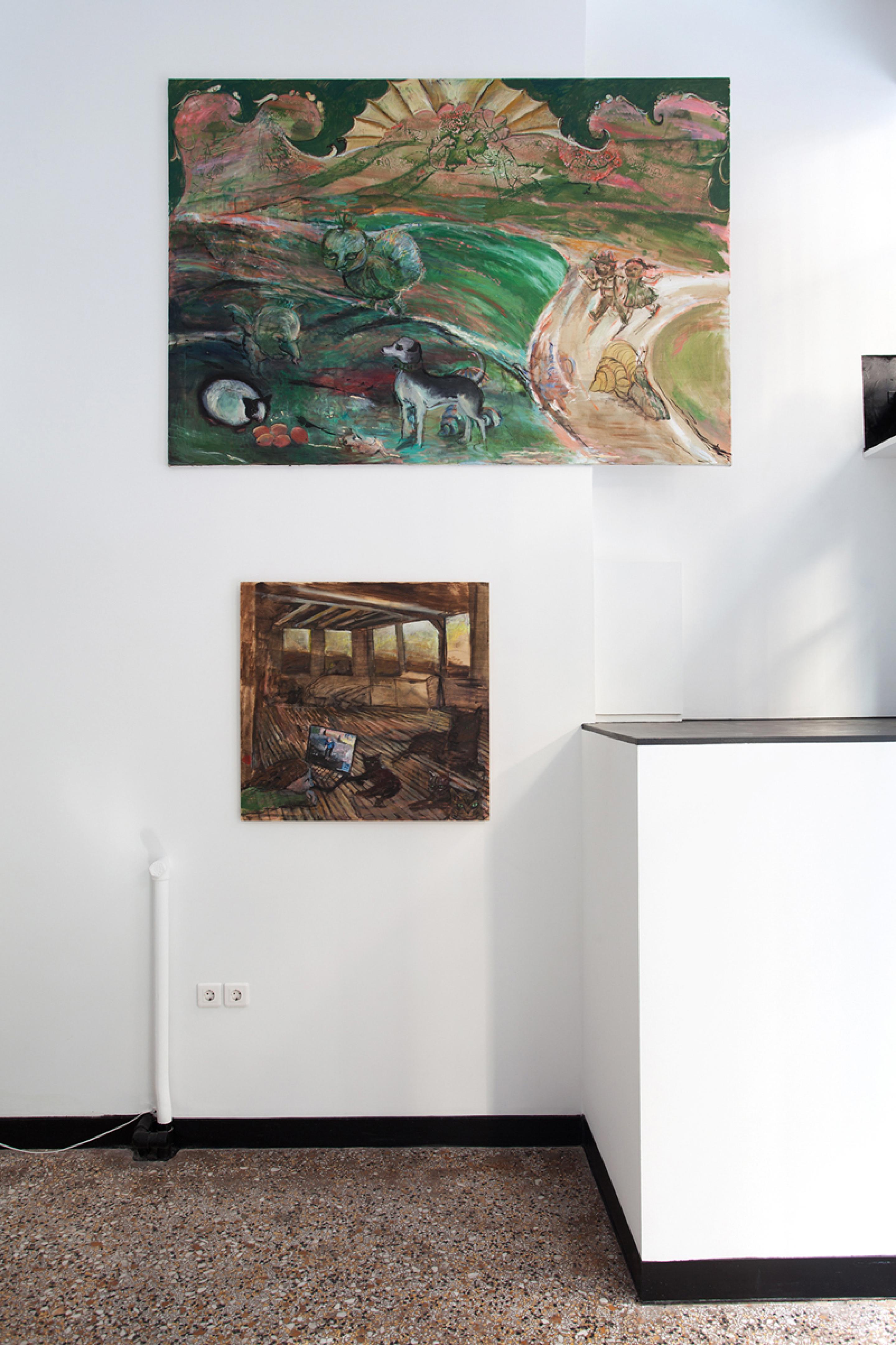 Amelie von Wulffen, Installation view, Hedwig’s Betrayal: Paintings, Comics and a Cupboard, Radio Athènes, Athens, 2019