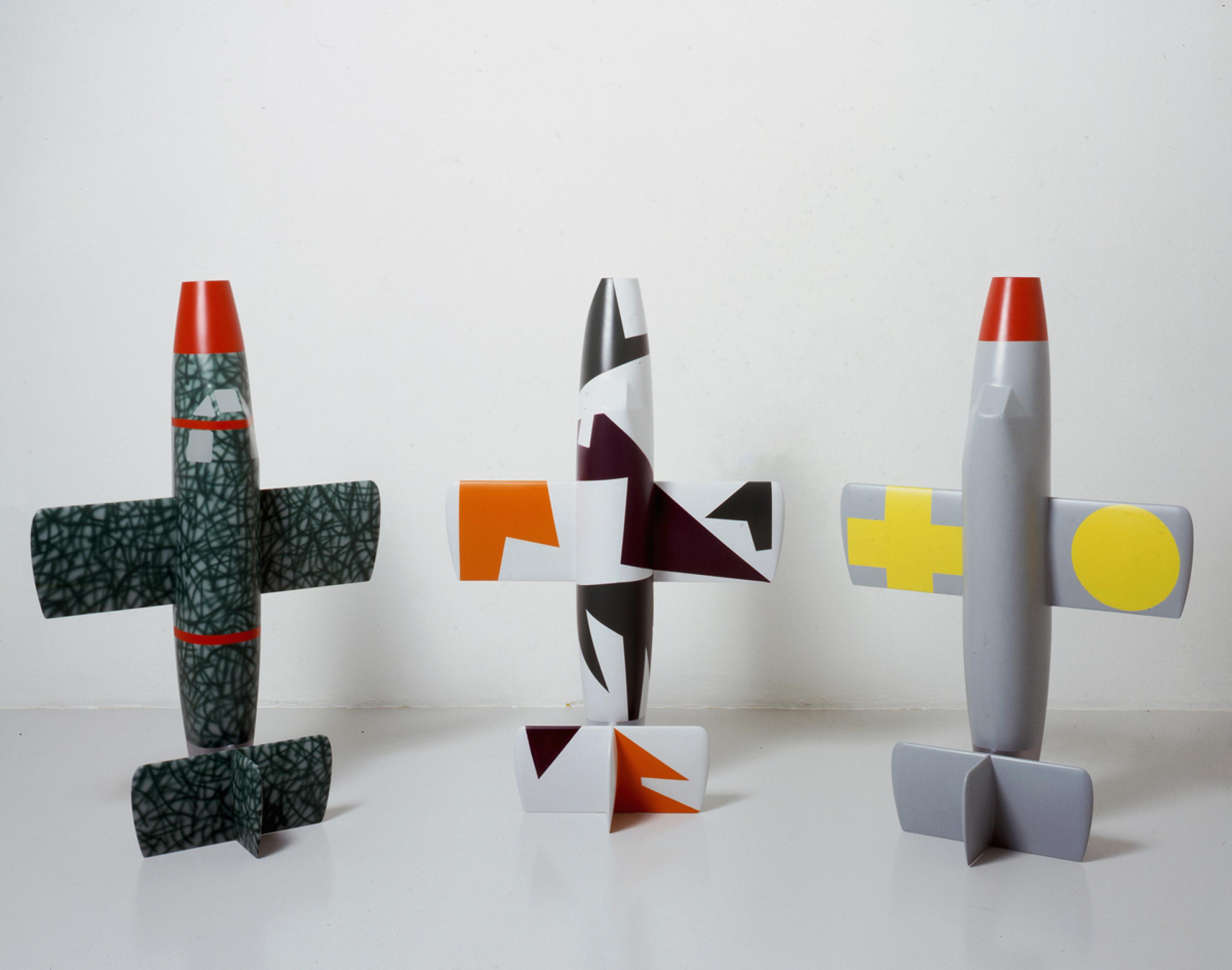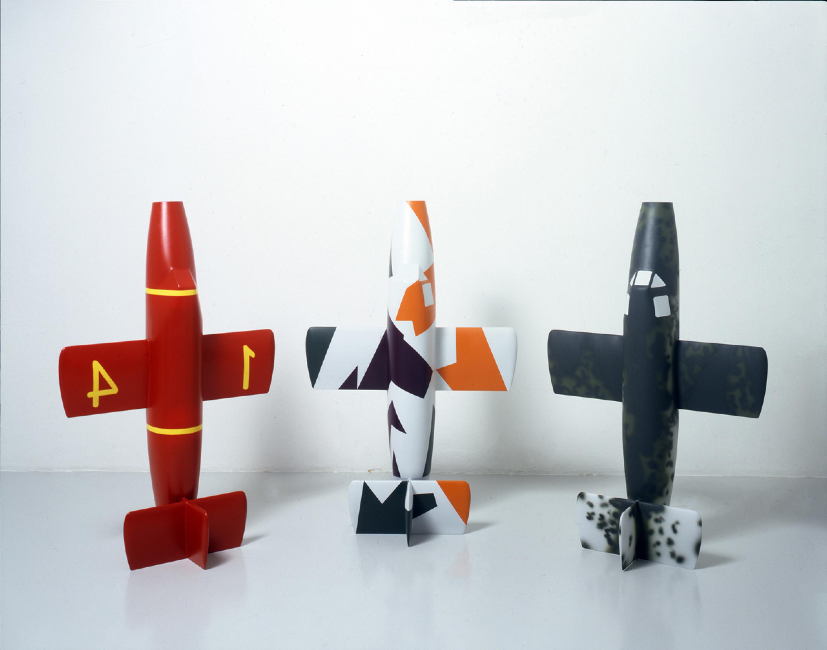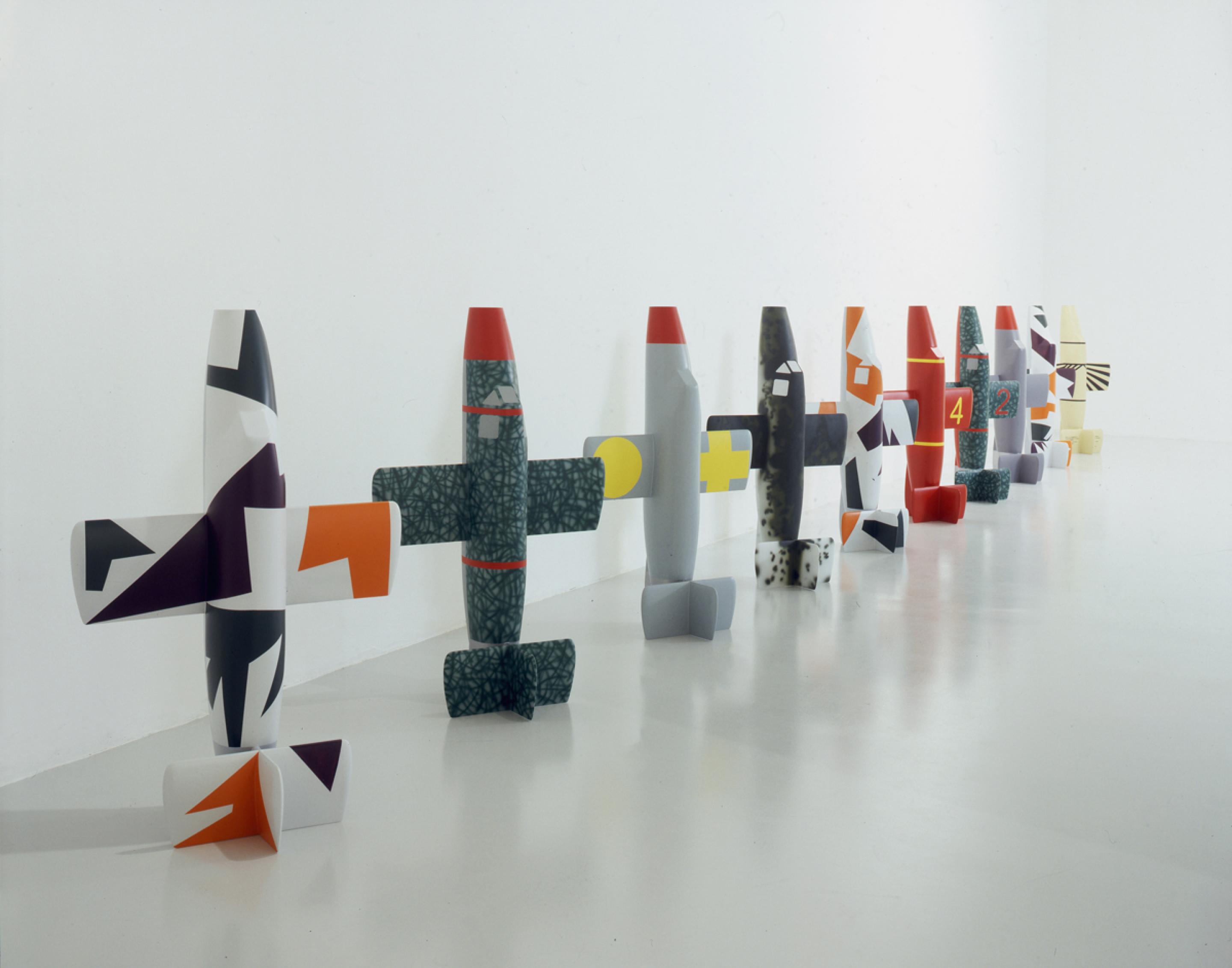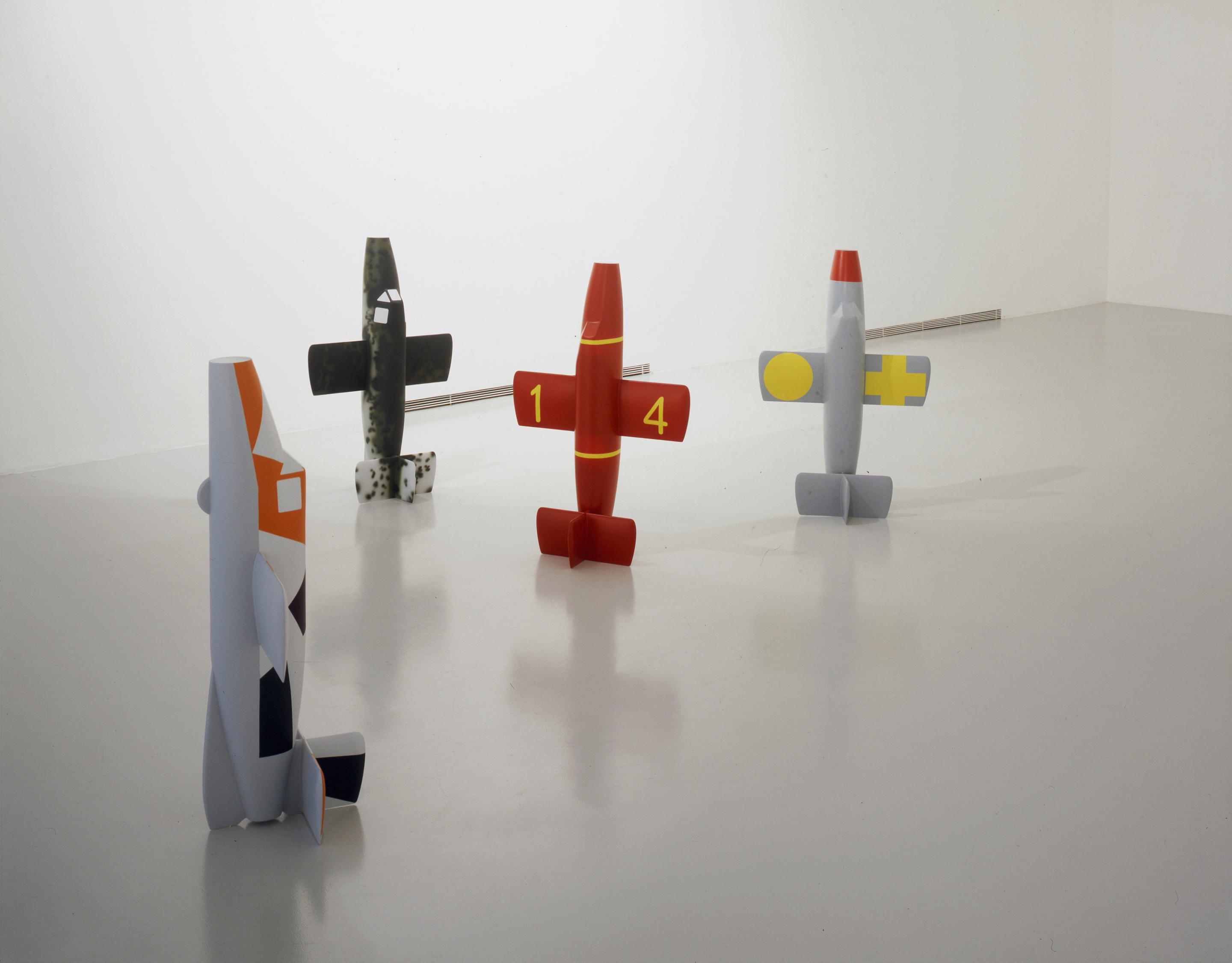 On the left side of the gallery Penguins (1987), 2005: eleven 1:6 scale models rocket planes Bachem Natter BA 349 B-1944 camouflaged in various ways. They are on the ground, in vertical position without a definite order. They are amouflaged through the gestalt method: the object are mixed up with the environment; they have got coloured geometrical forms with precise outlines.
