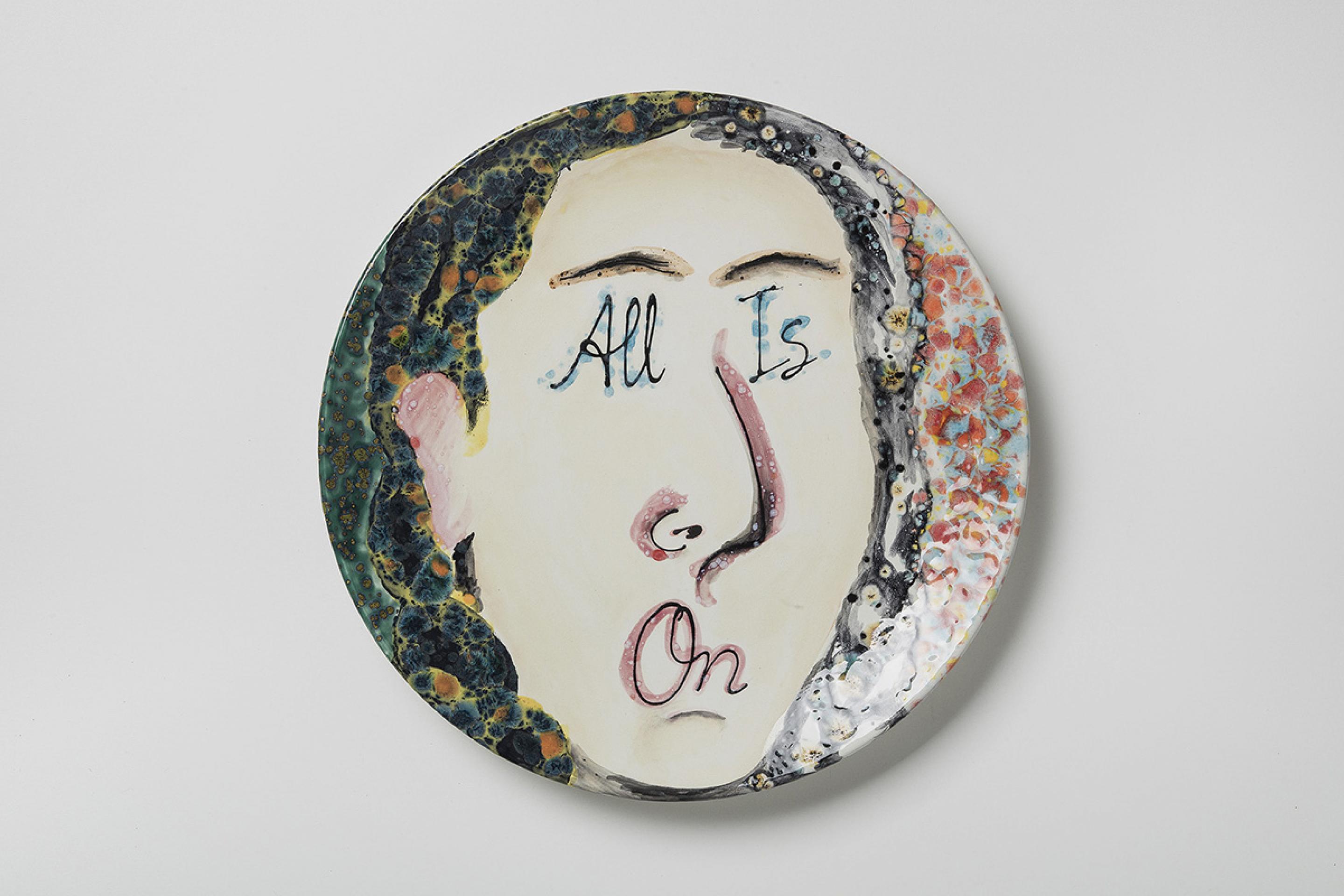 The attraction to glazing plates is entirely based on not knowing the end result. There are few activities in which painting can be so chance-based; in which heat is half the battle. The glazes go on in colours and textures entirely different to how they will end up; the elemental force of volcanic temperatures wreak their aesthetic havoc. Small crystal rocks embedded in the gunk chemically transform and imitate the effects of thousands of years of deep time – geology, mineraloids, the lithosphere, evolution – as well as more contemporary synthetics – plastic, candy, tie-dye, cake batter and glitter. What emerges often challenges my expectations and taste.
