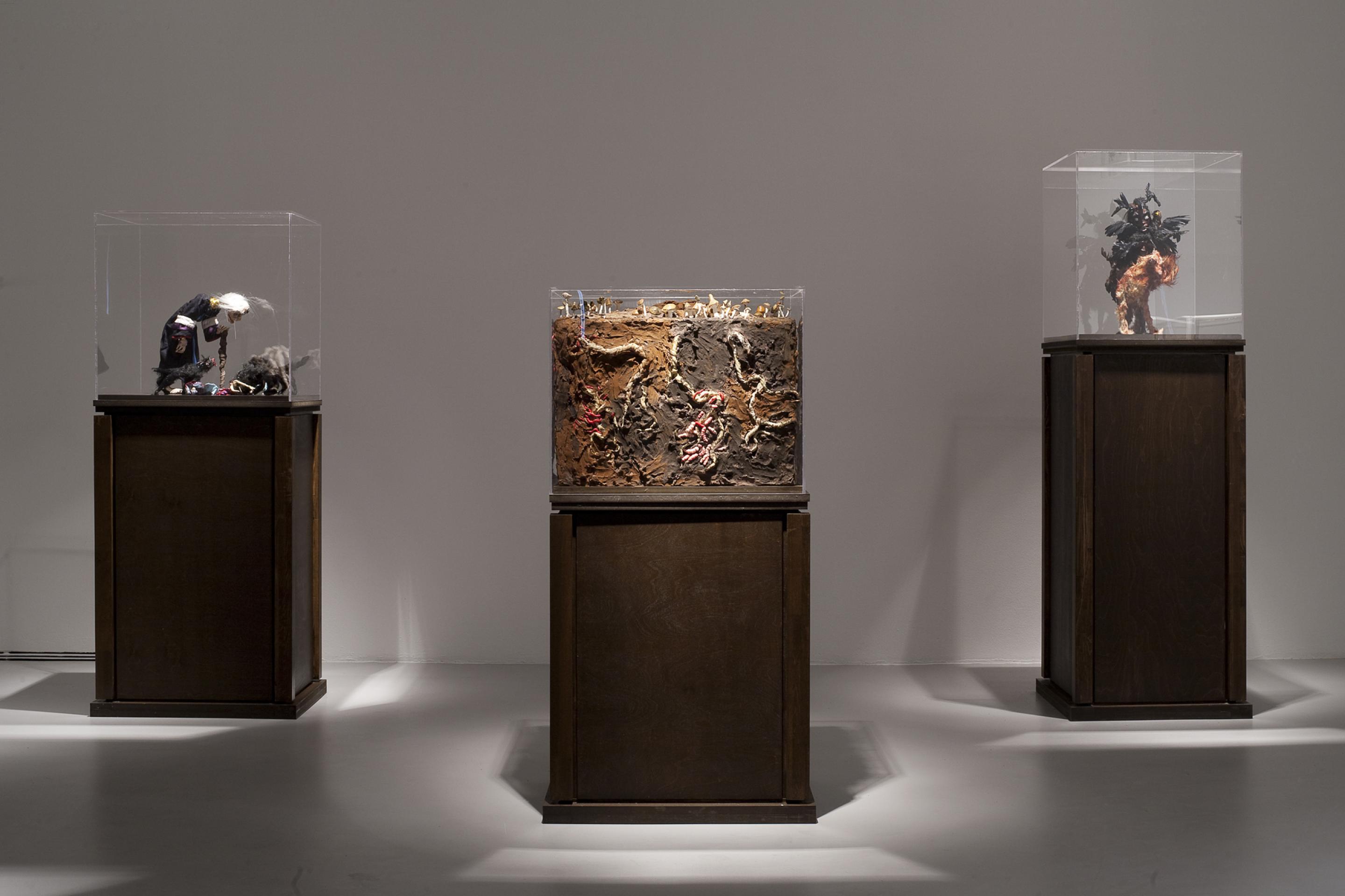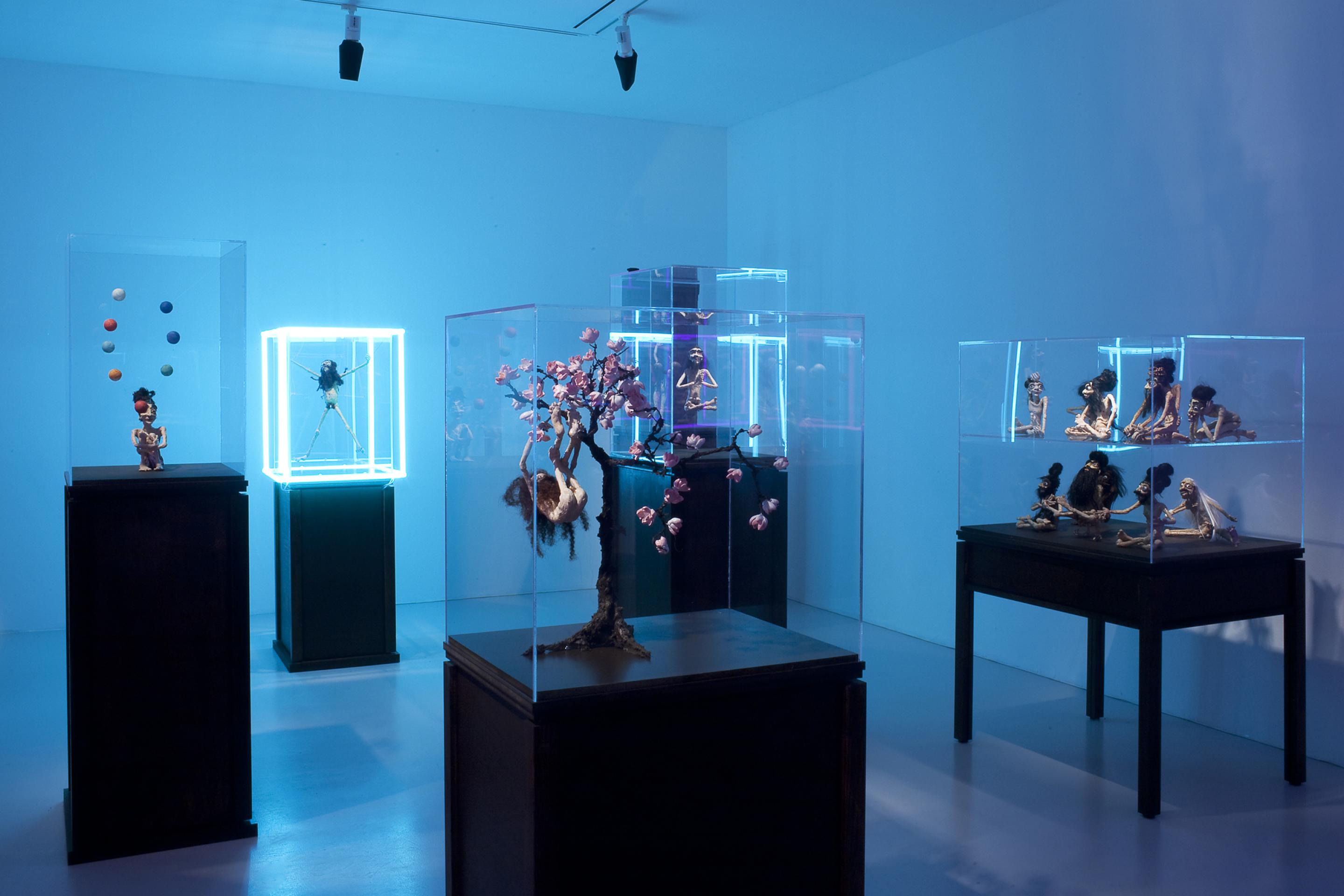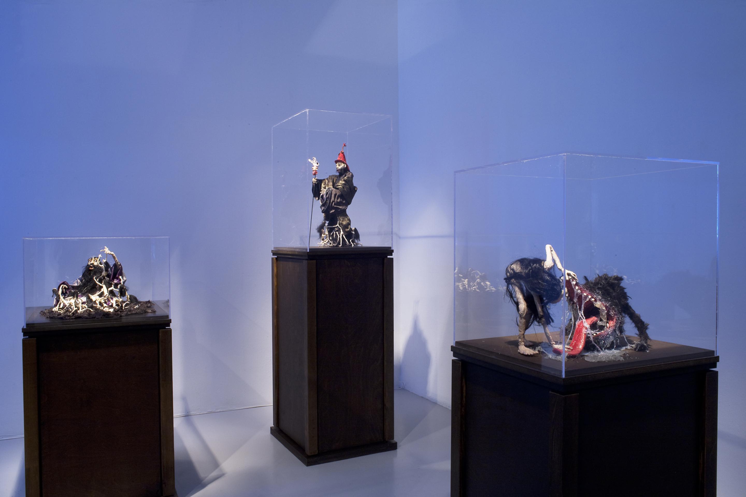 On display in the gallery will be 60 puppet sculptures that are presented in 41 plexiglass boxes positioned on wooden plinths. Two new films which are accompanied by soundtracks of Hans Berg that are underscoring and intensifying the works are especially made for the exhibition.
