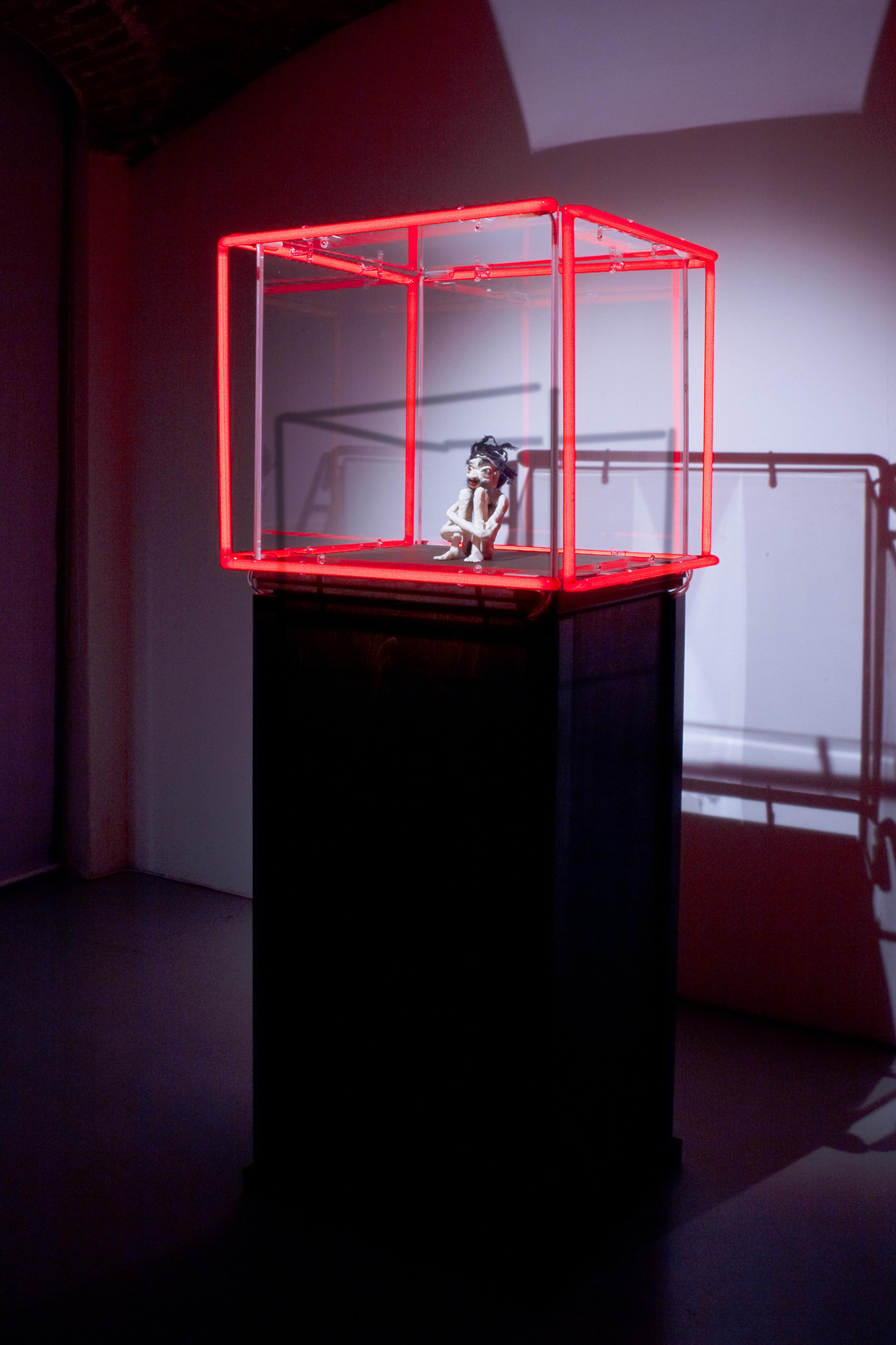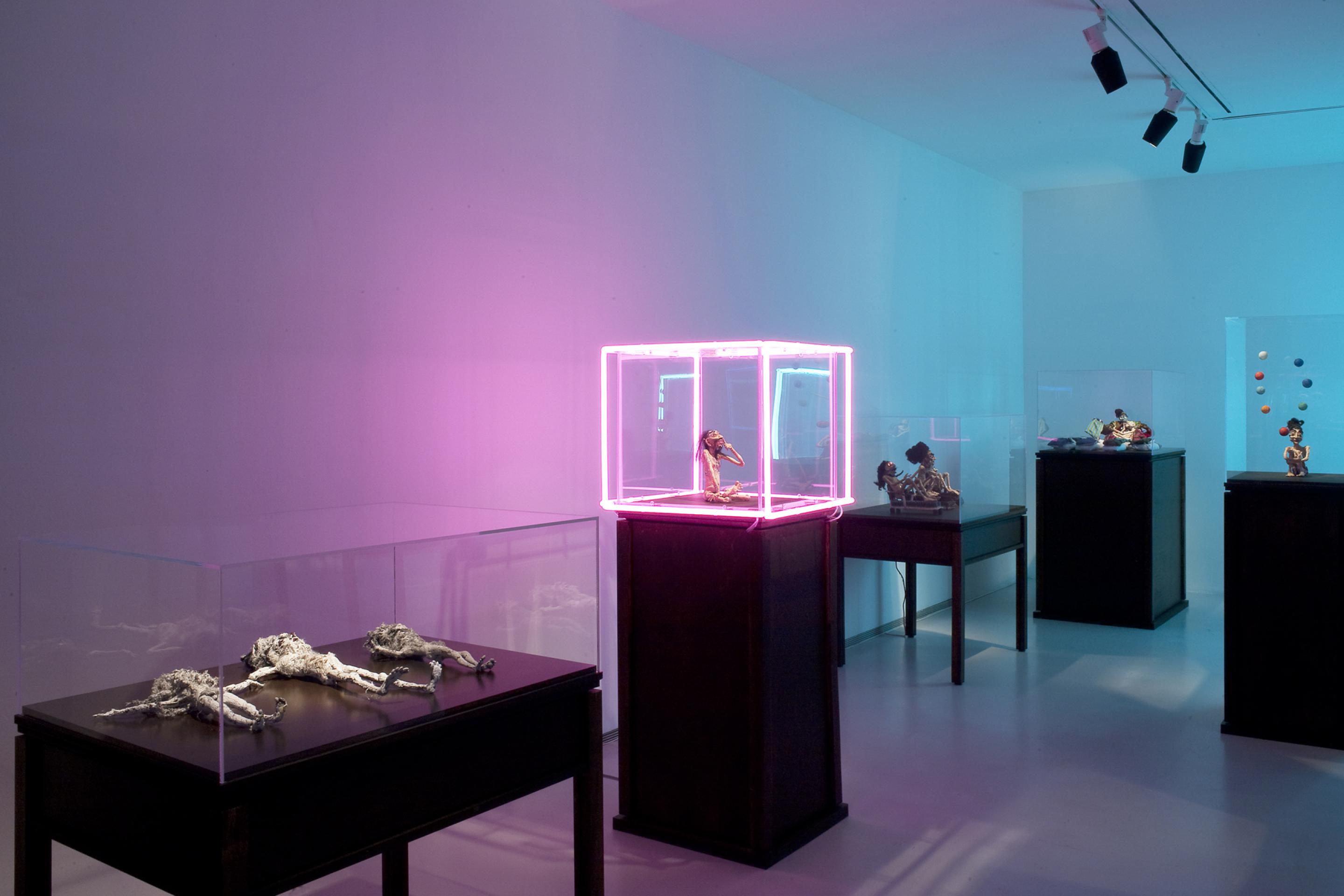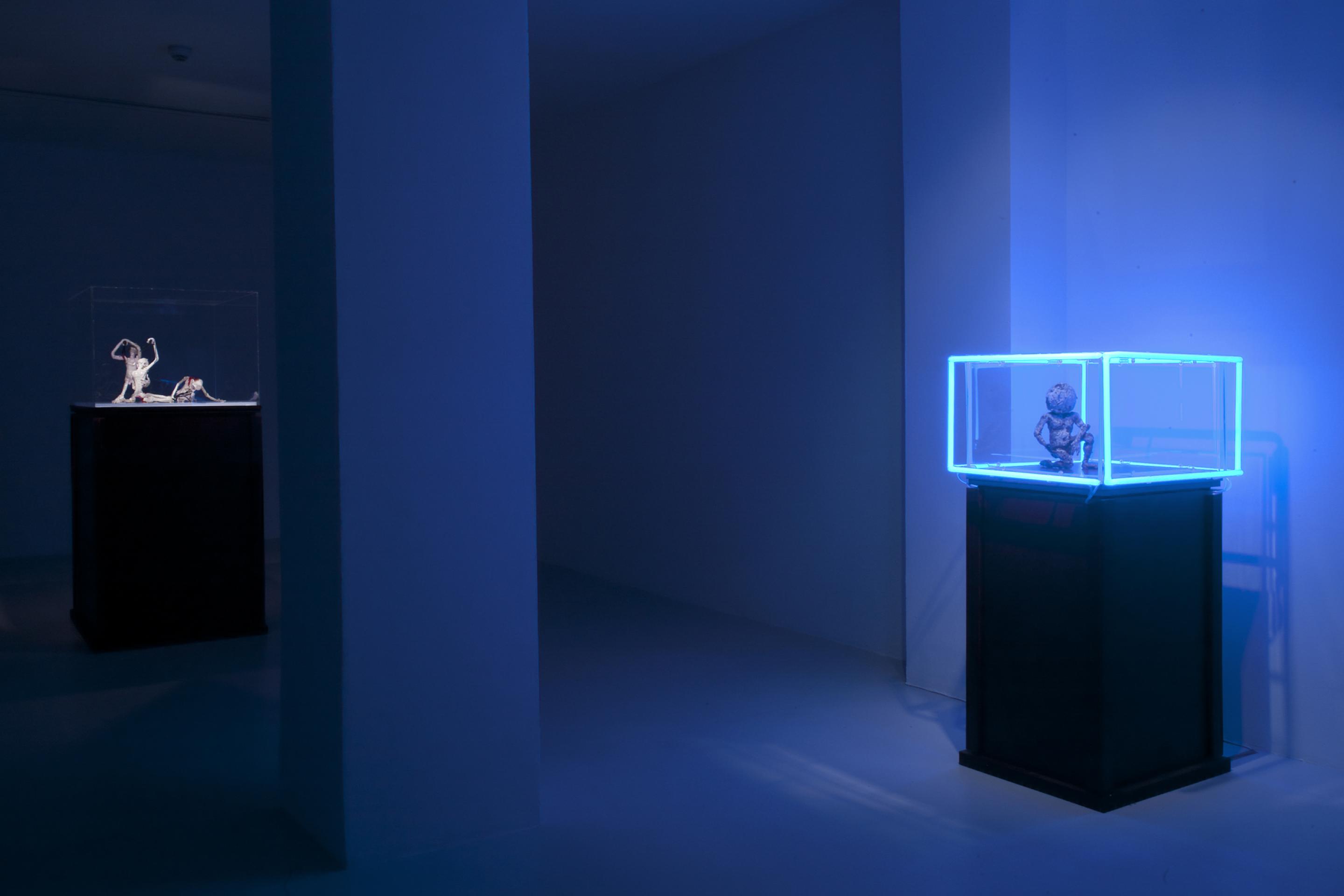 The sculptures, that are all self-formed figures of plasticine and cloth are characters that derive from Western to Eastern religion and out of a mythological context: It is a world of holy men, martyrs, ascetics and fairy tale creatures who search for spiritual and religious enlightenment: there are, for example, the three men that are flagellating themselves, there is the skinny old man dangling from the twig of a tree. Another man is positioned in the midst of a field of blooming cactuses with long and sharp thorns. Another one is given water by a fairy that seems to have stepped down right out of heaven and yet another ascetic looking man is strung to a bed of nails. Eight of these plinths on which all the various sculptures are being shown have different neon tubes in pink, blue, yellow and red attached to the edges of their plexiglass covers. They are symbolizing the characters’ cathartic journey from the depth of the purgatory and darkness into a literally enlightened state of mind.