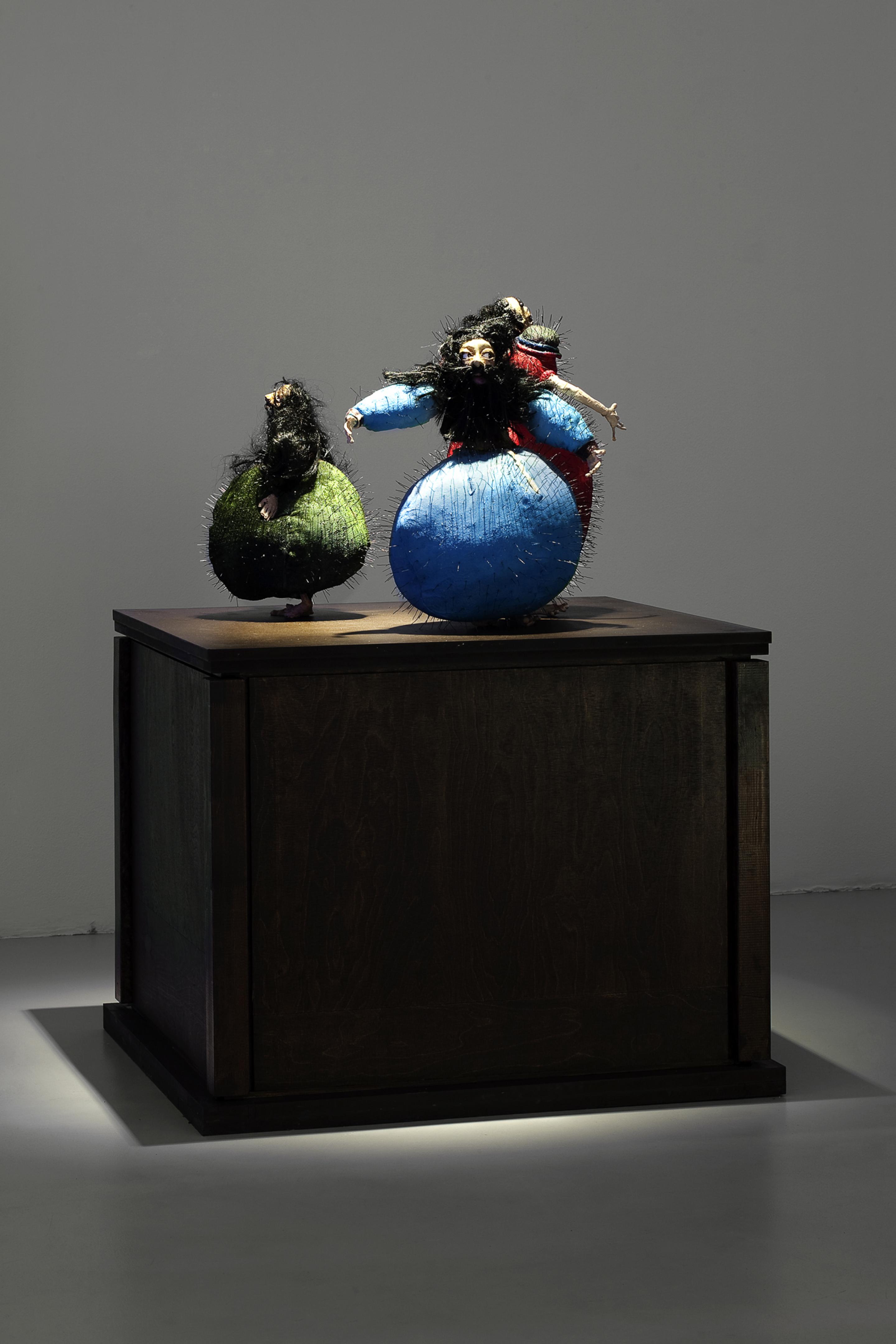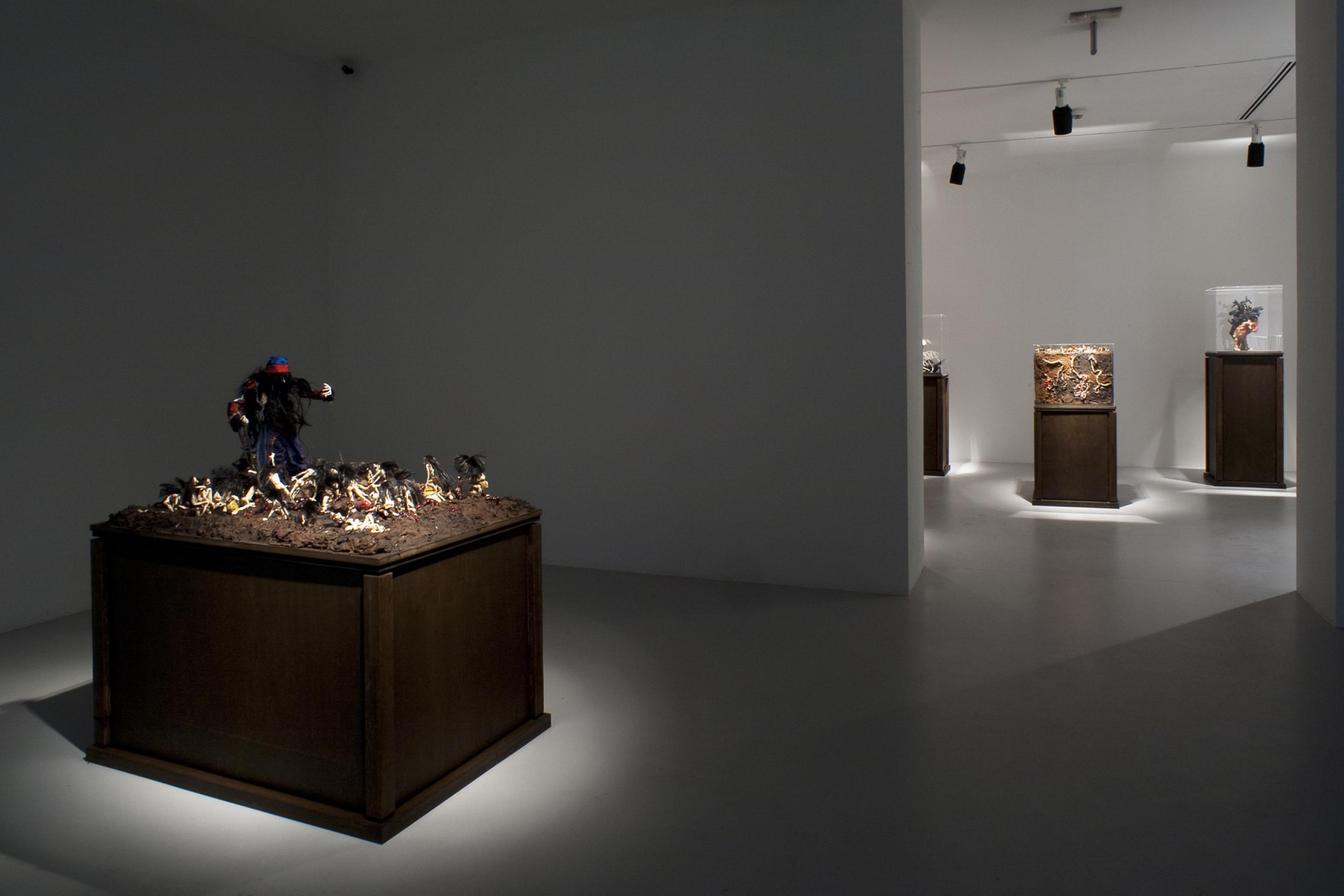 In mostra 60 pupazzi - sculture, presentate in 41 box in plexiglass su piedistalli di legno, e due nuovi video, accompagnati dalla musica di Hans Berg, che puntualmente ne sottolinea e intensifica il messaggio. Le musiche sono state composte ex novo per la mostra.Le sculture in plastilina, modellate e vestite dall'artista, ritraggono personaggi - simbolo dell'uomo mistico, con riferimenti alle religioni occidentali e orientali. E' un mondo popolato di martiri, asceti e creature fantastiche che sono alla ricerca dell' illuminazione", religiosa e spirituale: tre uomini si autoflagellano, un uomo anziano e magro pende dal ramo di un albero, un altro si trova nel mezzo di un campo di rigogliosi cactus con lunghe e affilate spine, o ne vediamo uno dissetato da una fata che sembra appena scesa dal cielo e un asceta è sdraiato su un letto di spine.