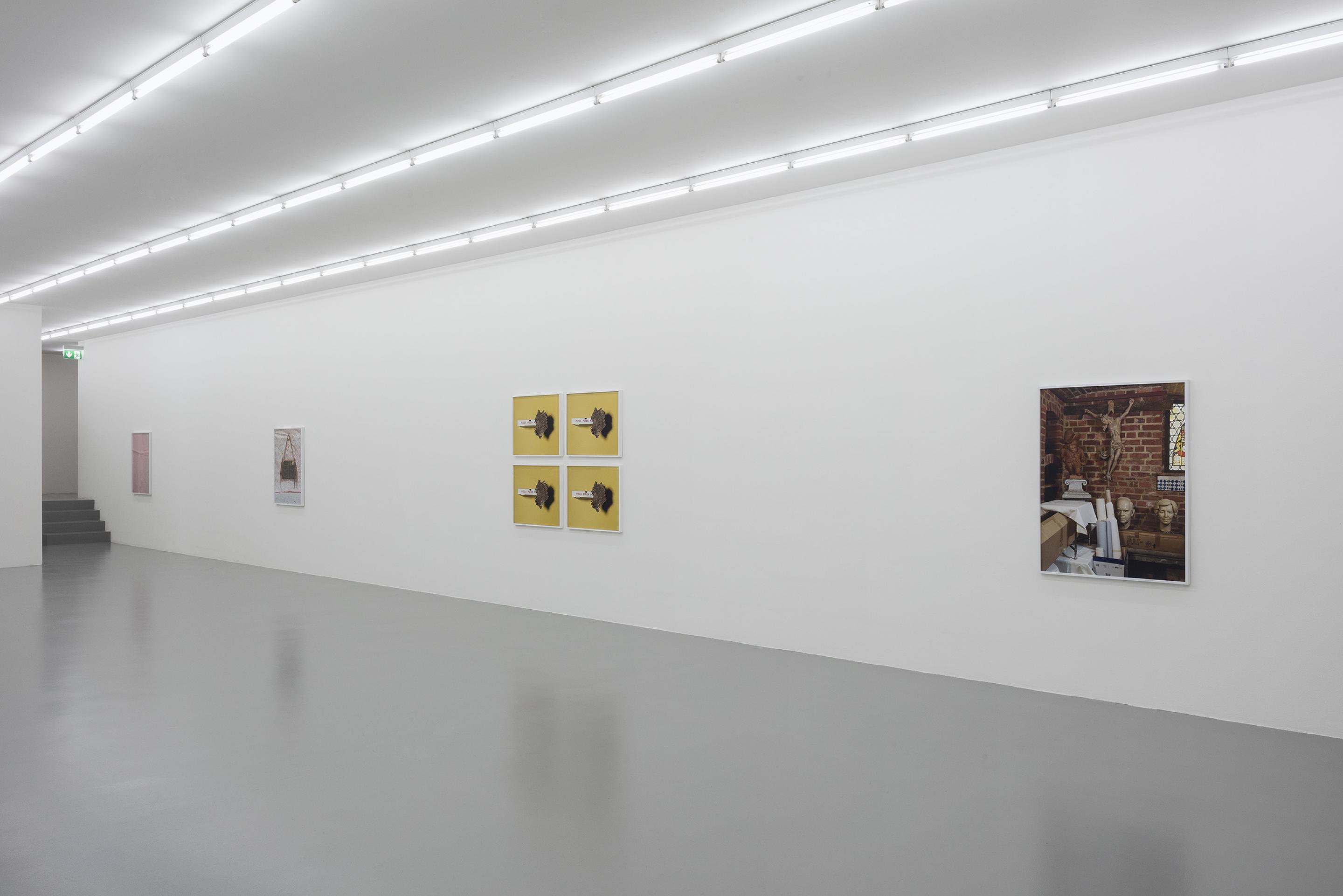 Juxtaposing solid and ephemeral objects, nature and (consumer) culture is a recurring motif in Annette Kelms work. The four identical prints Pizza Pizza Pizza show the side of an upright standing pizza cardboard box with the image title imprinted, photographed from above. Placed on the box is a piece of tree bark that casts a dark shadow on the bright yellow backdrop. In Gems a tiny book about Gemstones and the delicate leaves of an annual honesty lay on a dotted background that resembles Photoshop desktop backdrops. Honesty is also known as „money plant“ or "silver dollars" as its seedpods have the appearance of silvery coins. Currency, a recurring theme in Kelm’s recent work, is also at the center of 500 Euro. The photograph shows a post-it imitating a 500 Euro bill fixed by a string on a background canvas whose patterns imitate columns. Referring to the illusion of space in Trompe l'Oeil or Quodlibet paintings, the image targets the problem of the lack of material relation to value, currently evident in the global finance system.