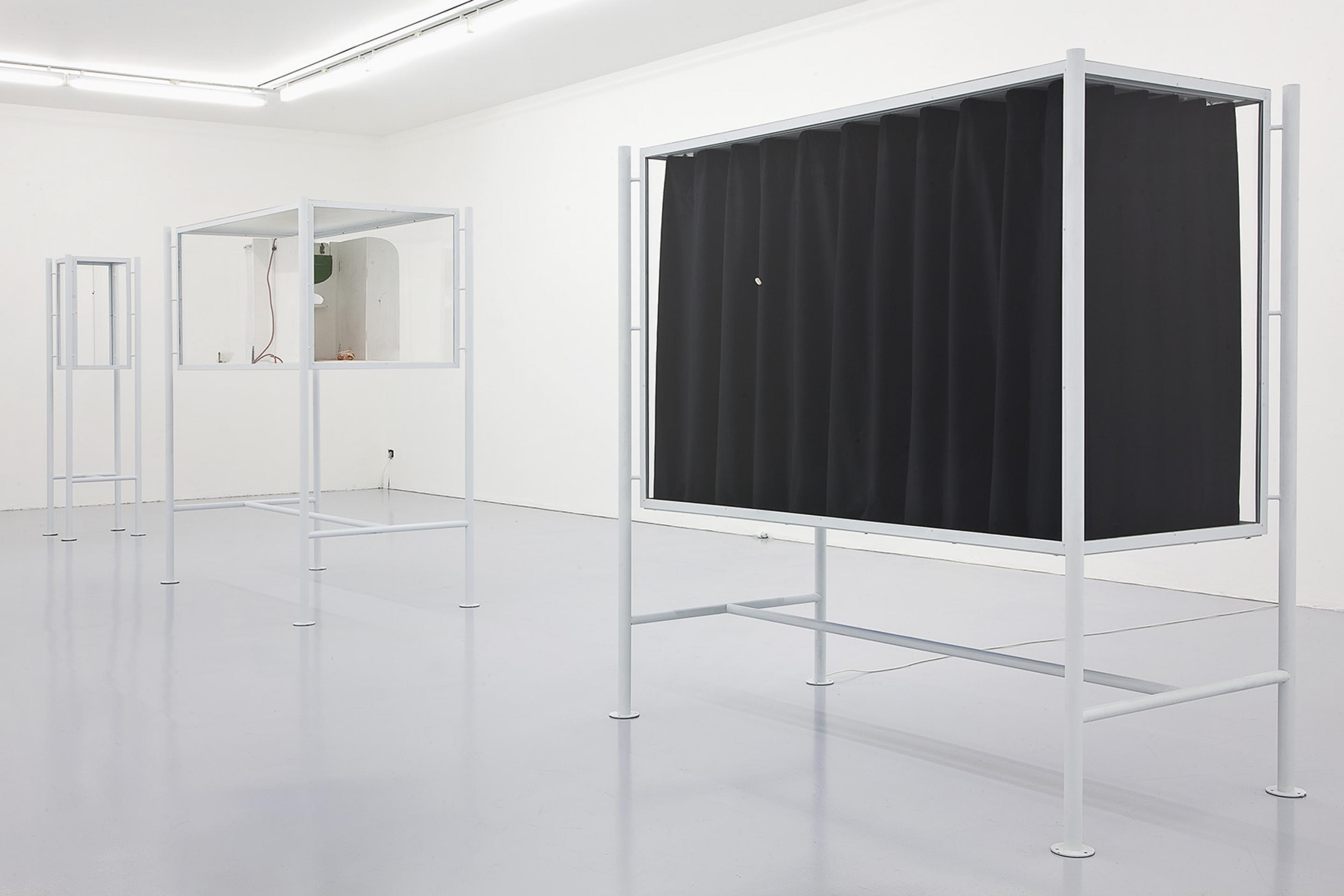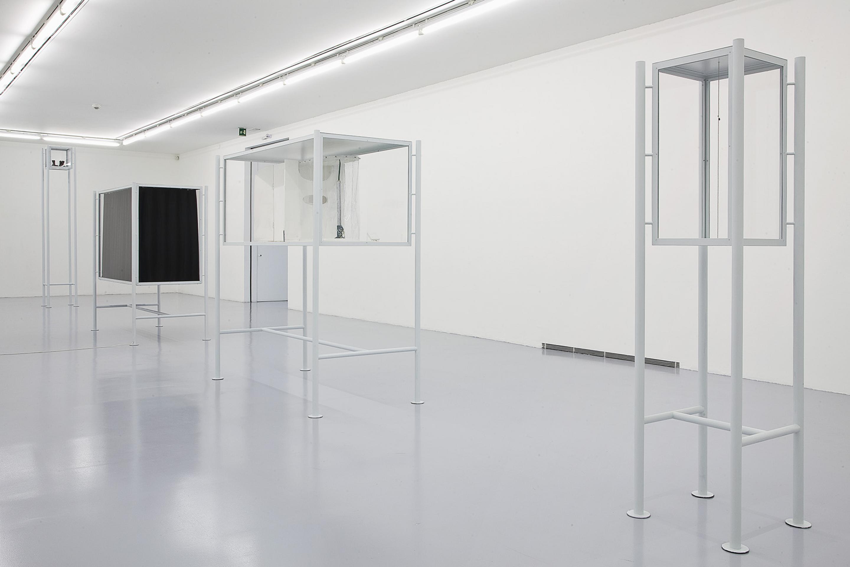 Then there is an installation made up of four display cases. Shoes are visible from below a three-meters high display case. A piece of chewing gum, pressed flat, can be seen on the sole of the shoe. Another display case contains a curtain, from behind which a light source emits unmotivated rhythms of light. In the third case a ball chain hangs vertically along with rabbit droppings. Finally, the fourth display case features a mechanism, which can be operated by hand from the outside showing how a tuft of hair strokes the nut and how a finger nail taps on a tablet. This display case is docked to a rack. Two pictures of the Muse, acting in the film “Above the point of the glowing silence”, hang above the rack.
