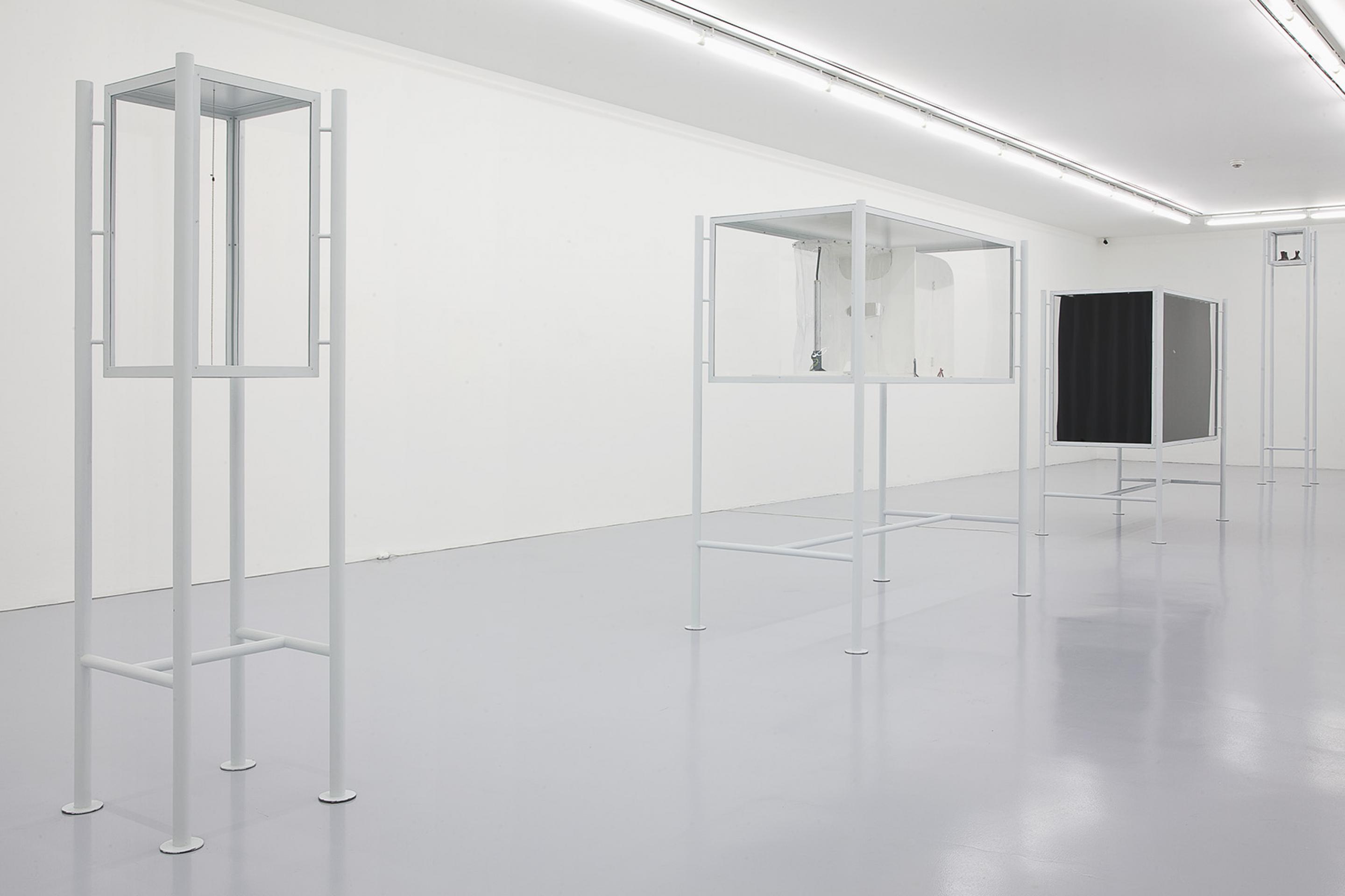 C’è poi un’installazione composta da quattro teche. In una di queste, alta tre metri, sono visibili in basso delle scarpe sulla cui suola è appiccicata una cicca. Un’altra contiene una tenda, dietro la quale una sorgente luminosa emette fasci di luce ritmica senza motivo. Nella terza teca è appesa in verticale una catena di biglie sulla quale si arrampica dello sterco di coniglio. La quarta invece contiene un meccanismo che può essere azionato a mano dall’esterno e che mostra un ciuffo di capelli che accarezza un bullone e un’unghia che dà dei colpetti ad una tavoletta. Questa teca è appoggiata ad una rastrelliera a cui sono appese due foto della Musa che recita nel film “Above the point of the glowing silence”.