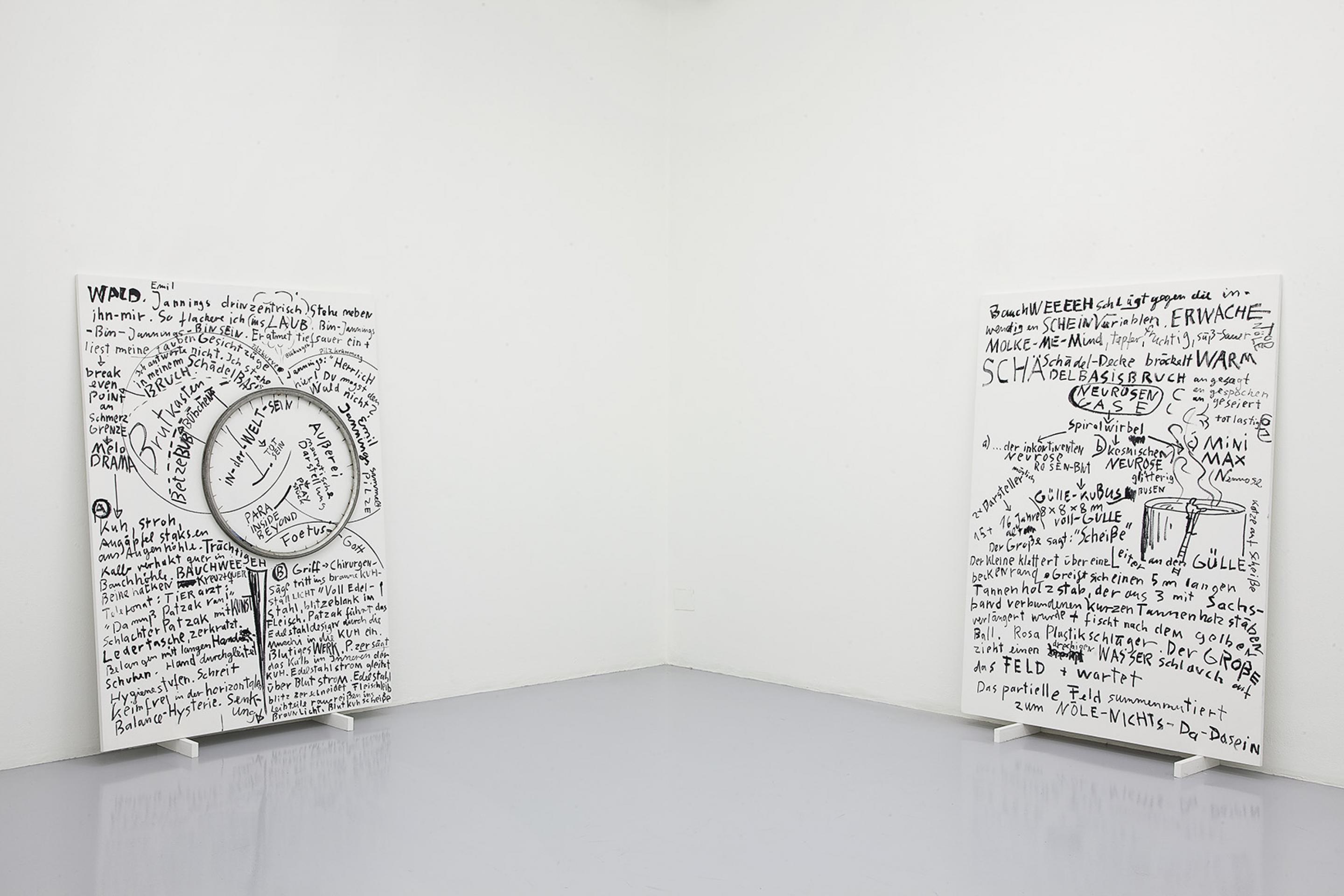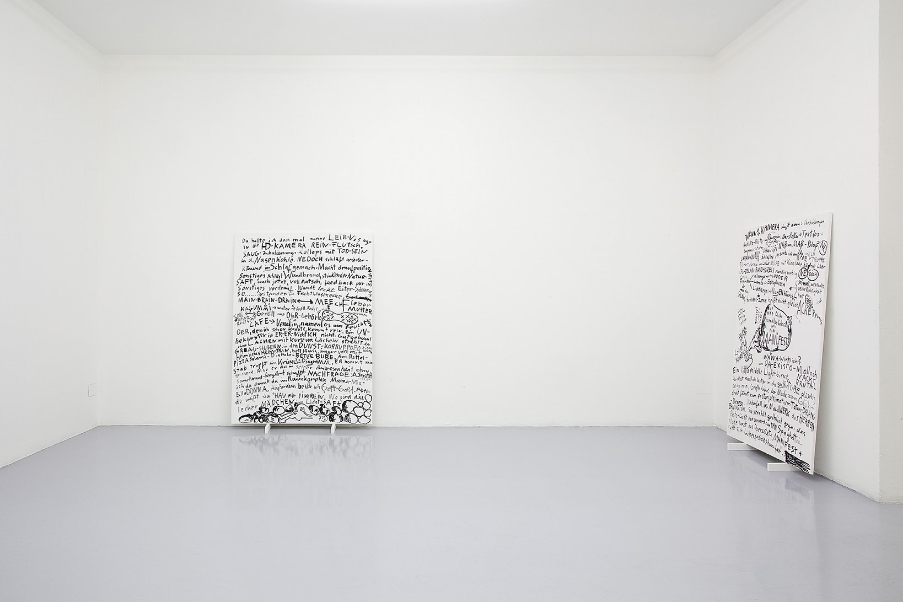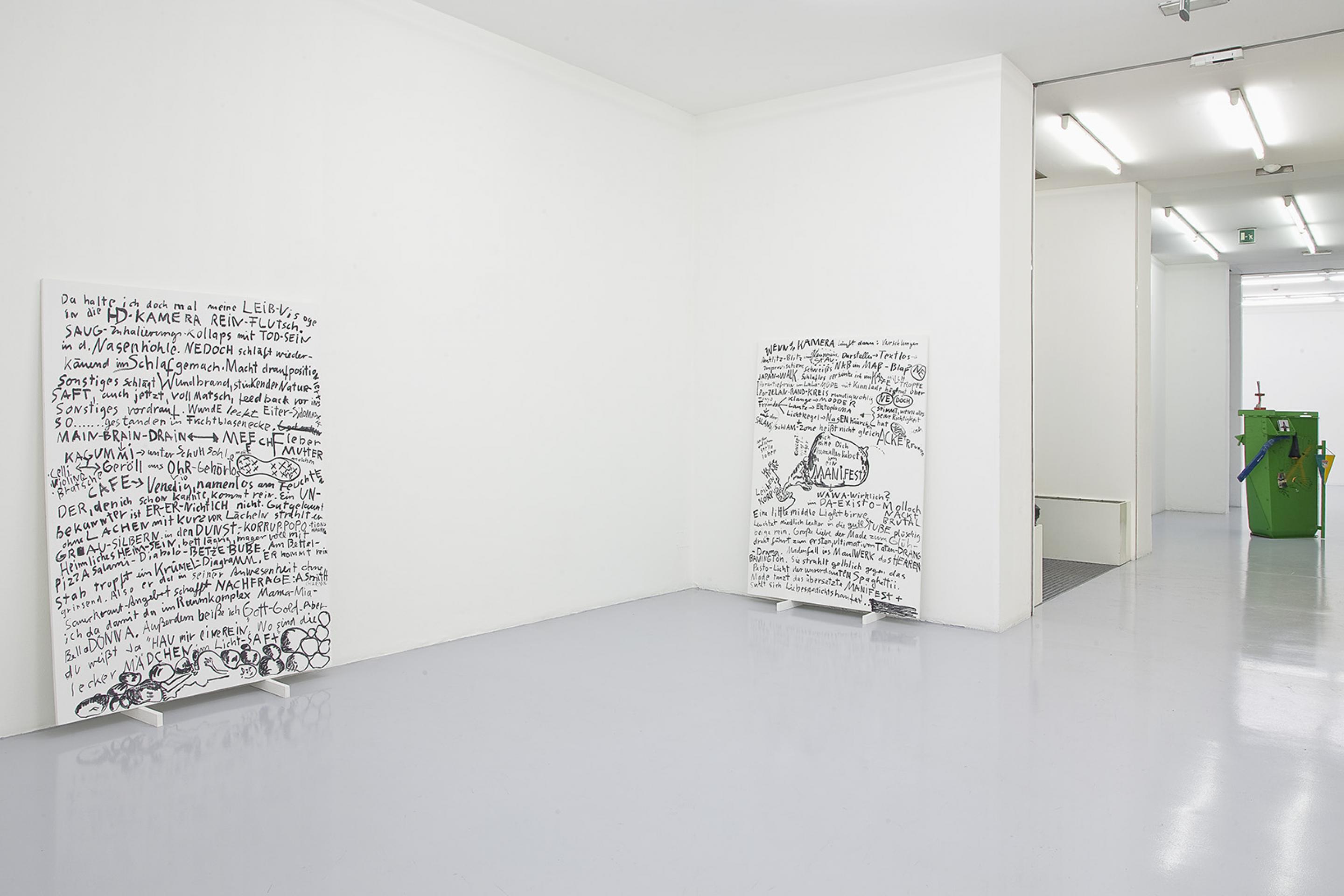 L’artista presenta inoltre tavole di testo, dove le parole, frasi tratte da azioni o film, sono ripetute, tagliate, incollate, scambiate, modificate, frammentate e riscritte in modo fastidioso.