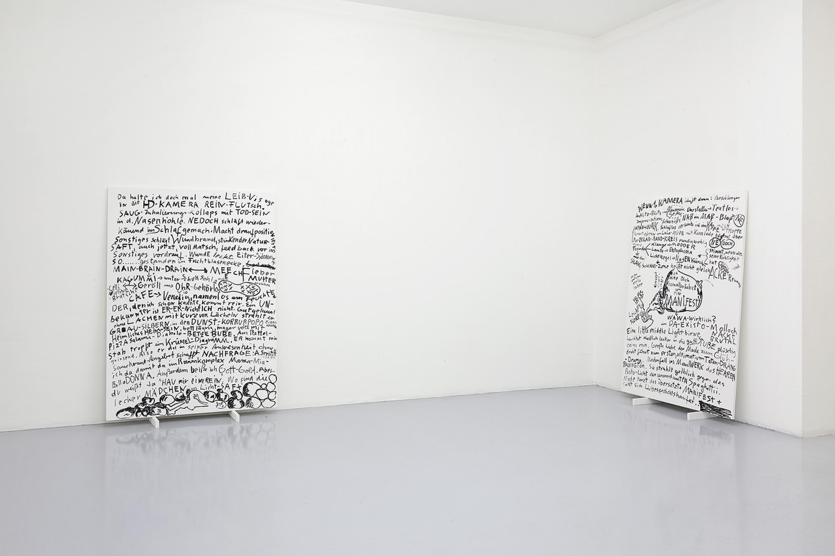 Furthermore, text panels are shown. In the text panels, words and phrases on actions and films are cut, collaged, mutated, unwritten and repeated annoyingly. They are fragmented, rearranged and written again.