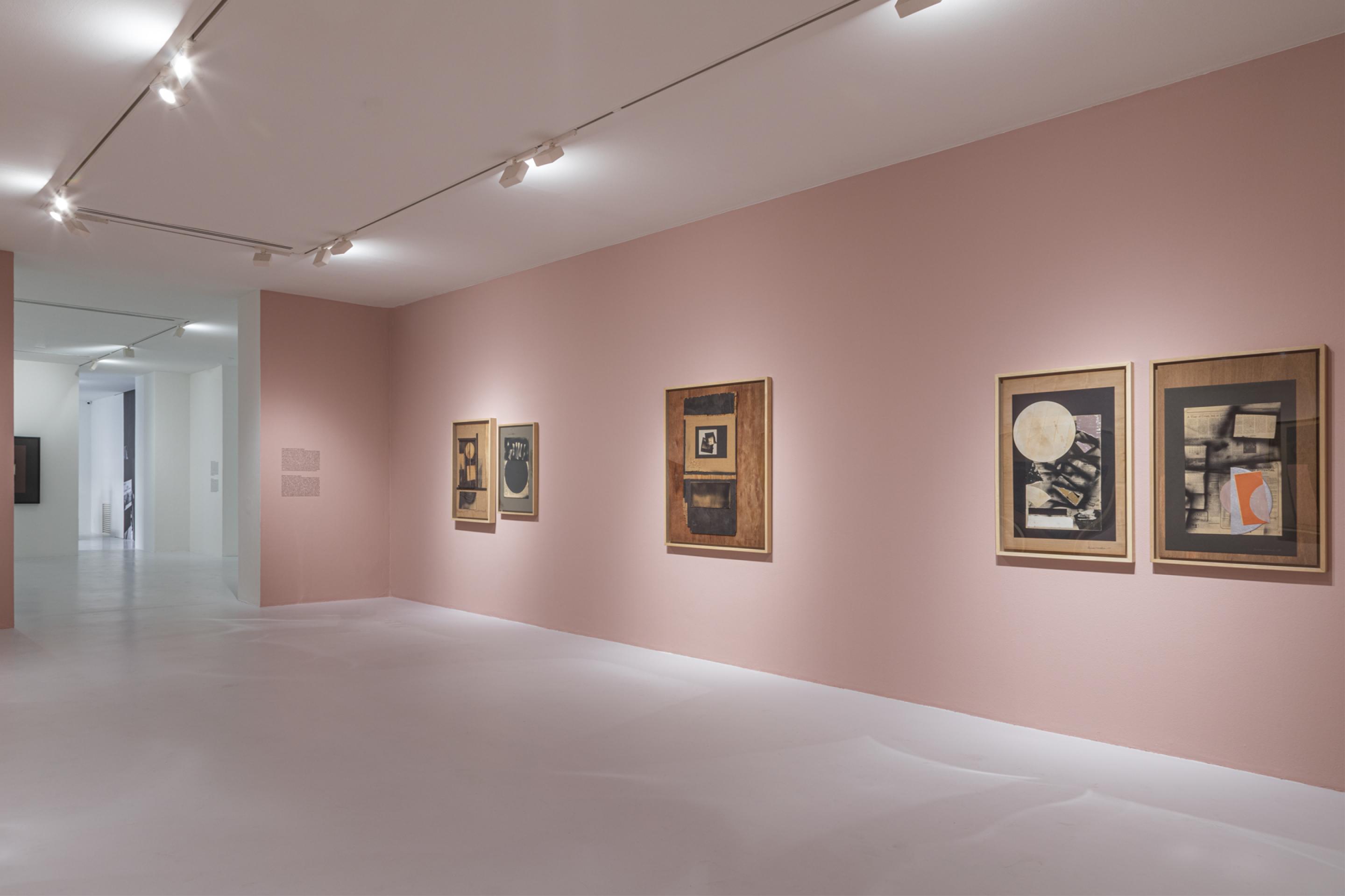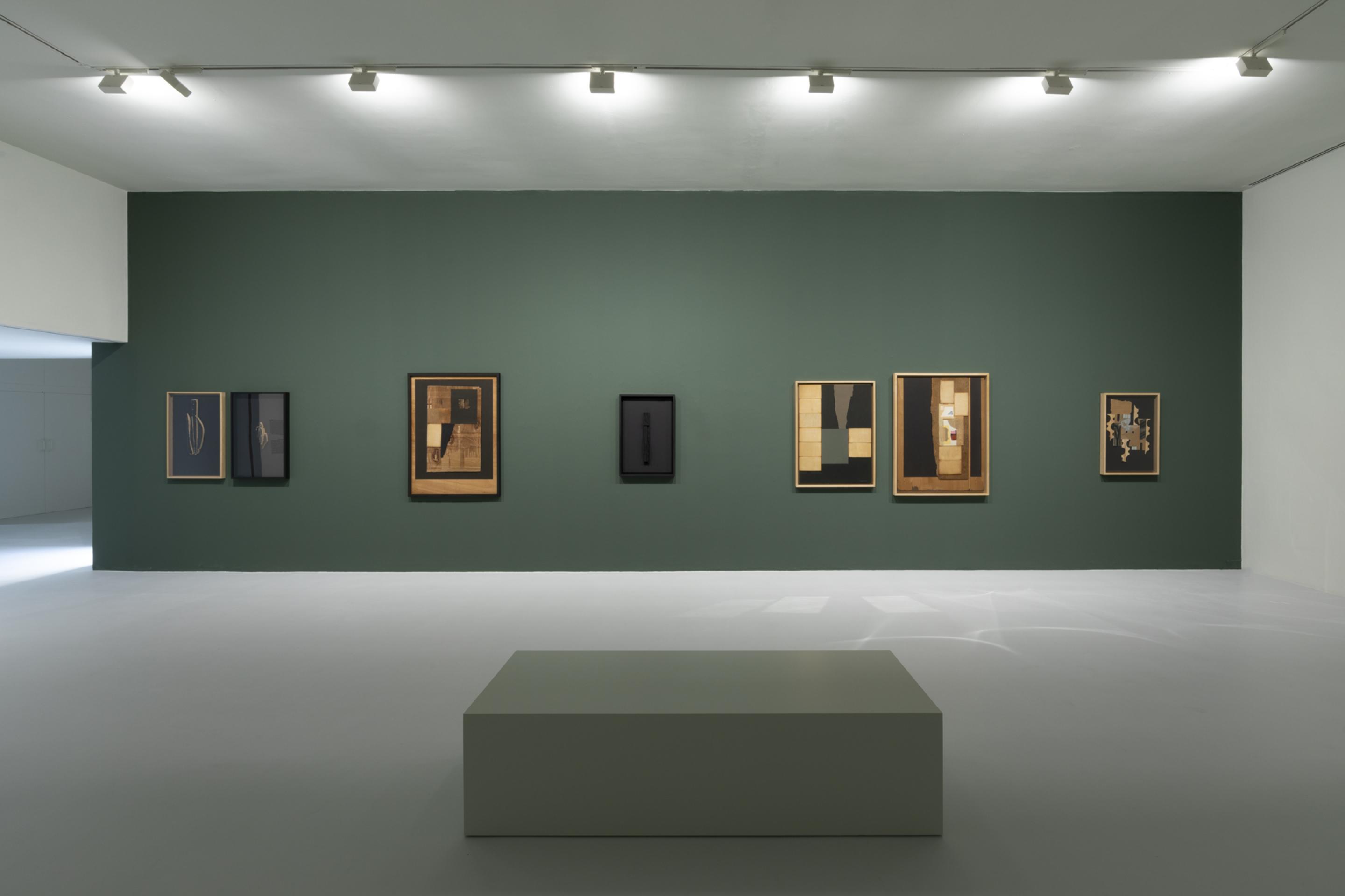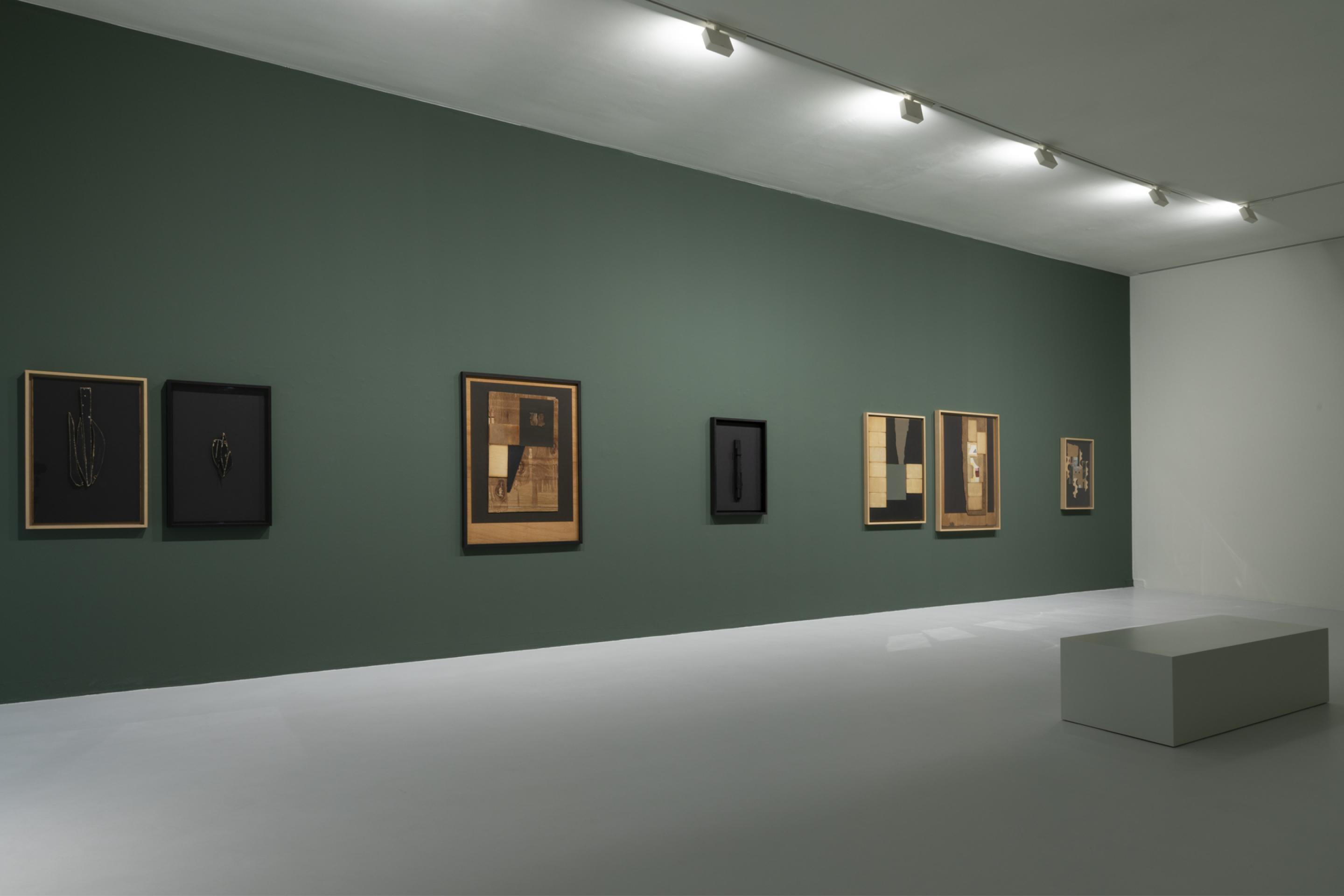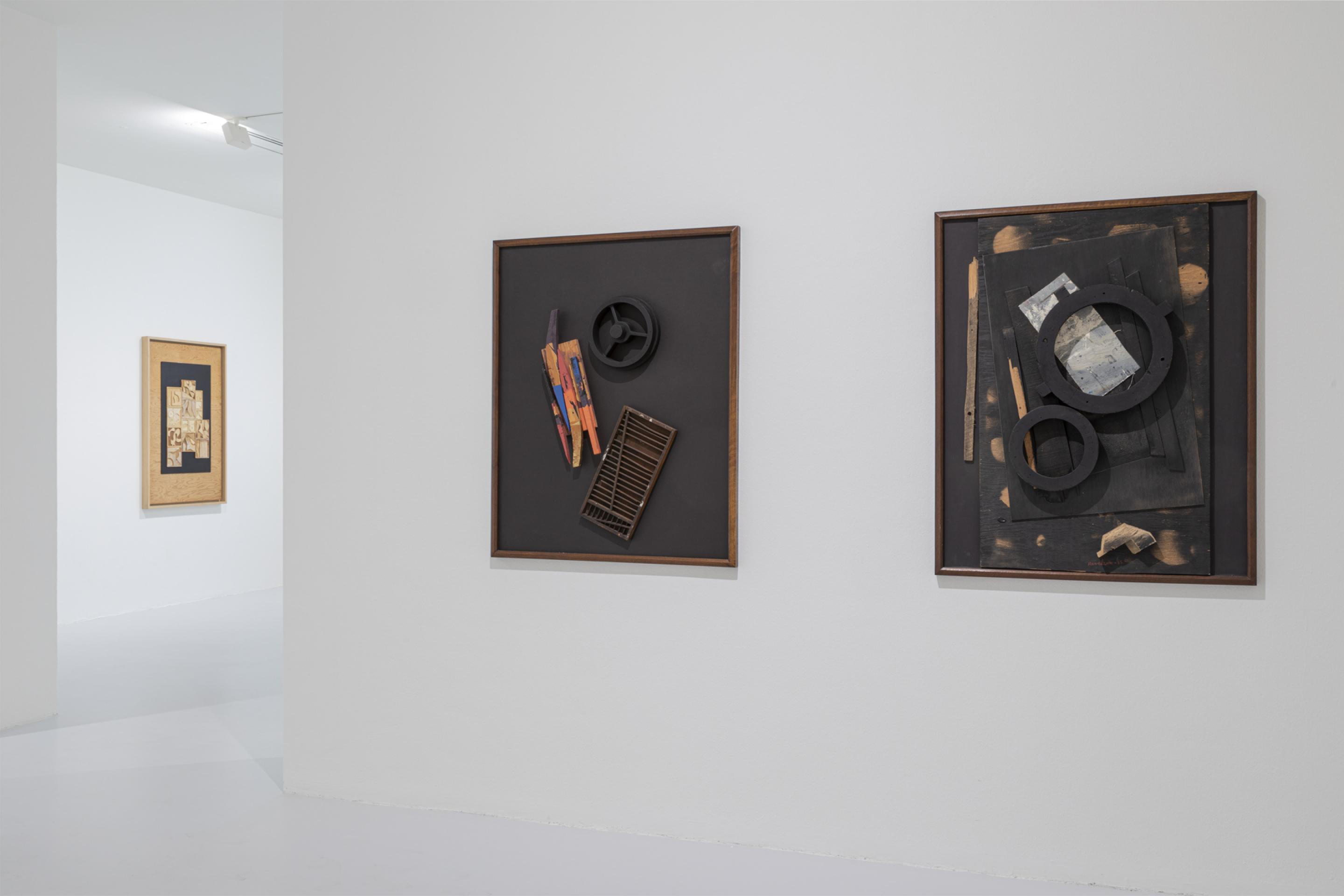 L’esposizione milanese raccoglie un’ampia selezione di collages che l’artista, forte della lezione cubista appresa durante i viaggi in Europa, realizza a partire dagli anni Cinquanta, combinando supporti lignei e cartacei e ottenendo originali esiti prospettici.
