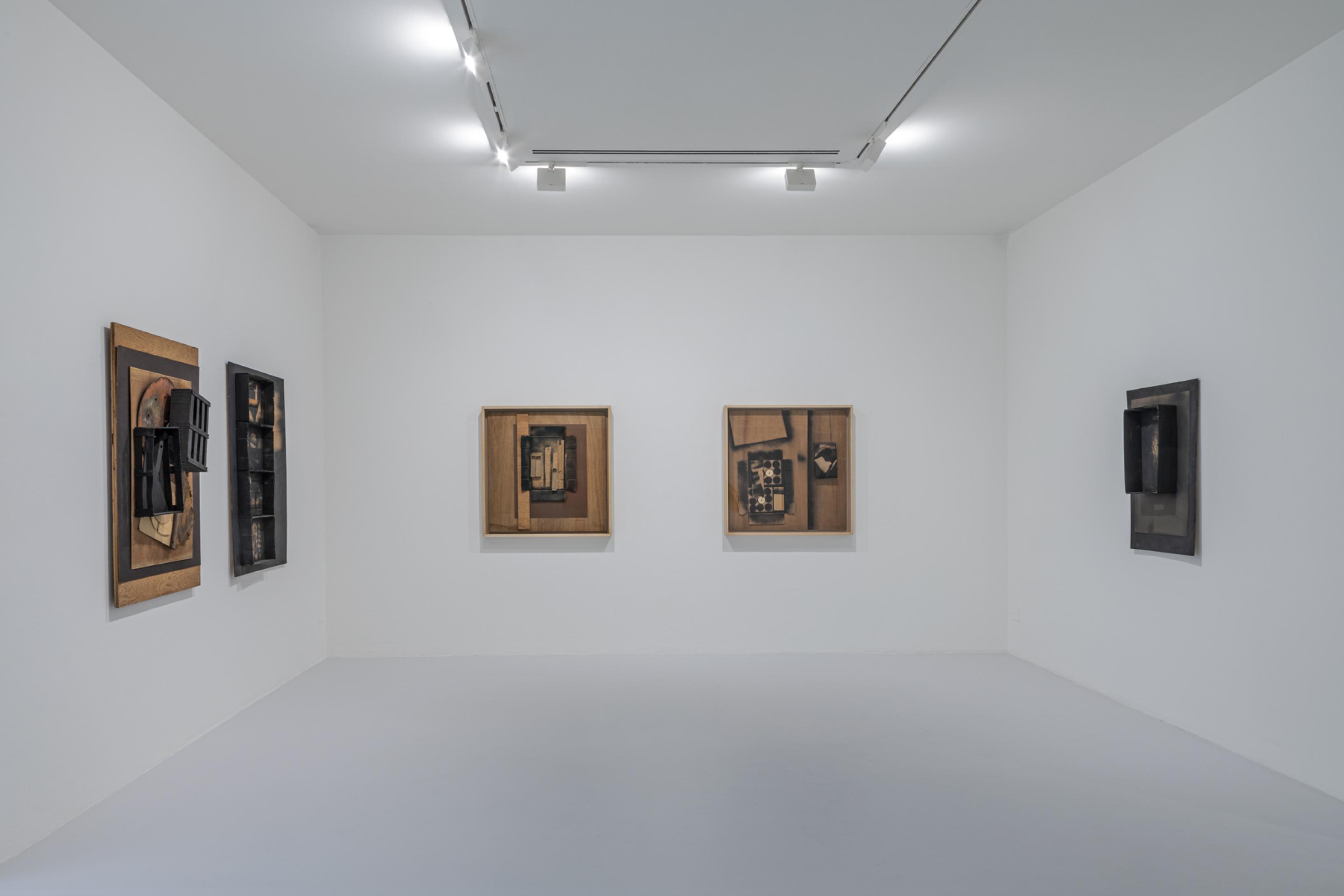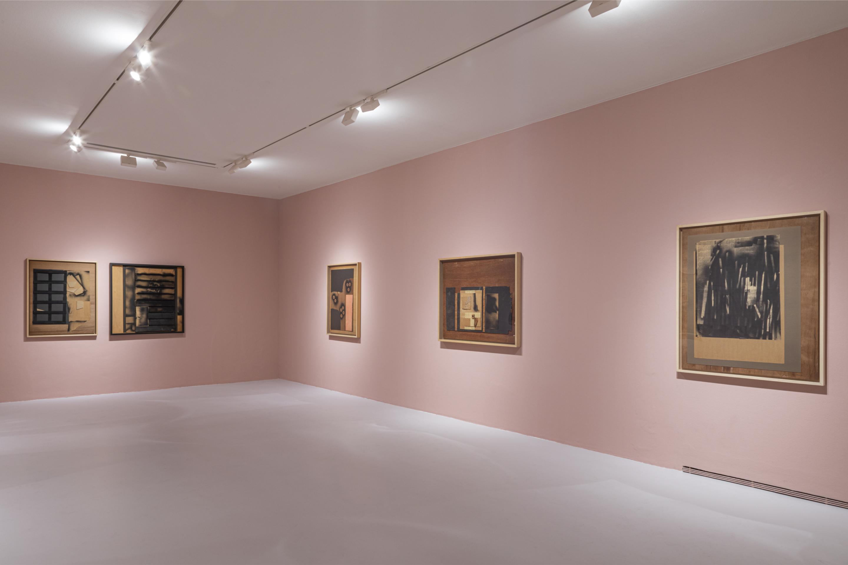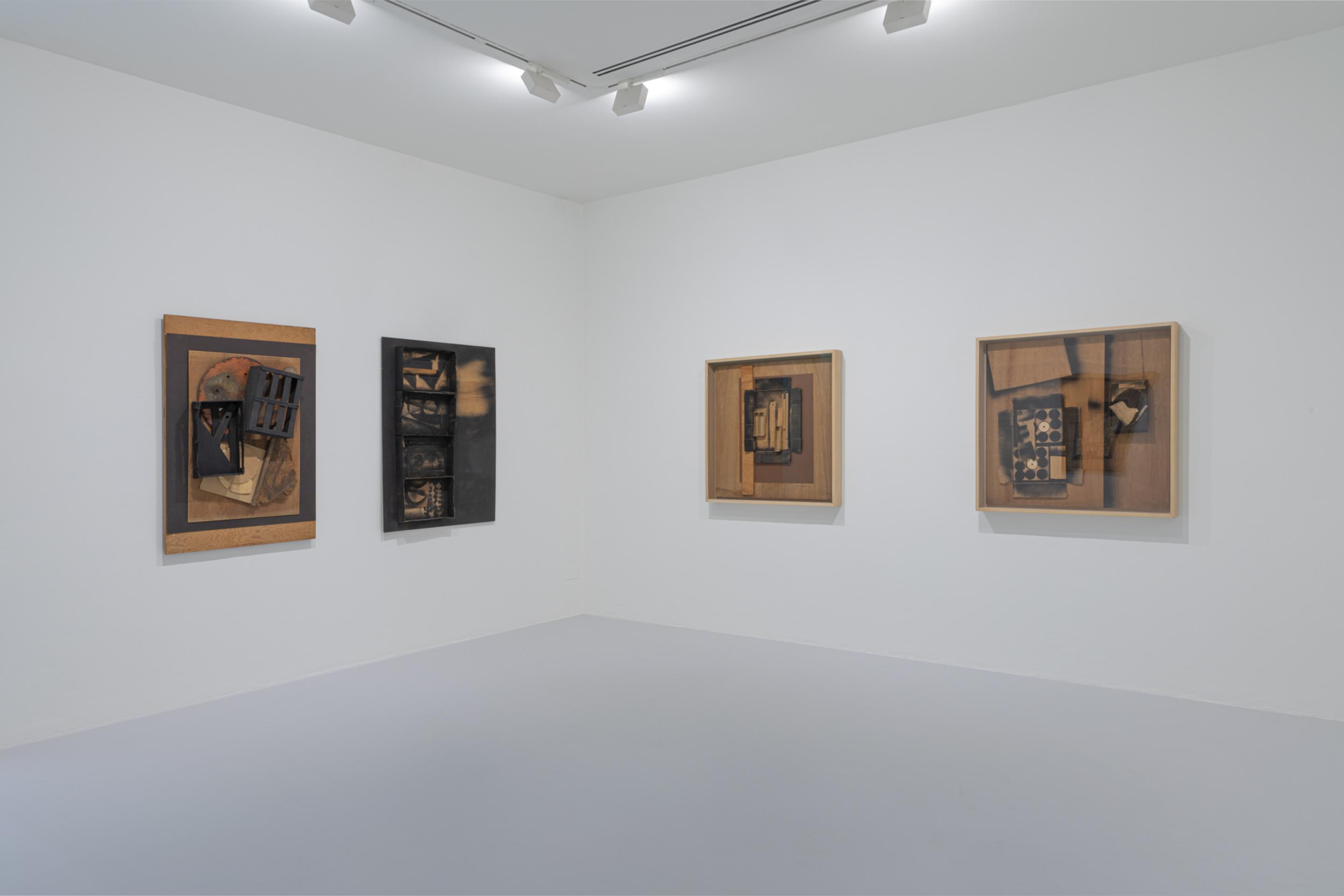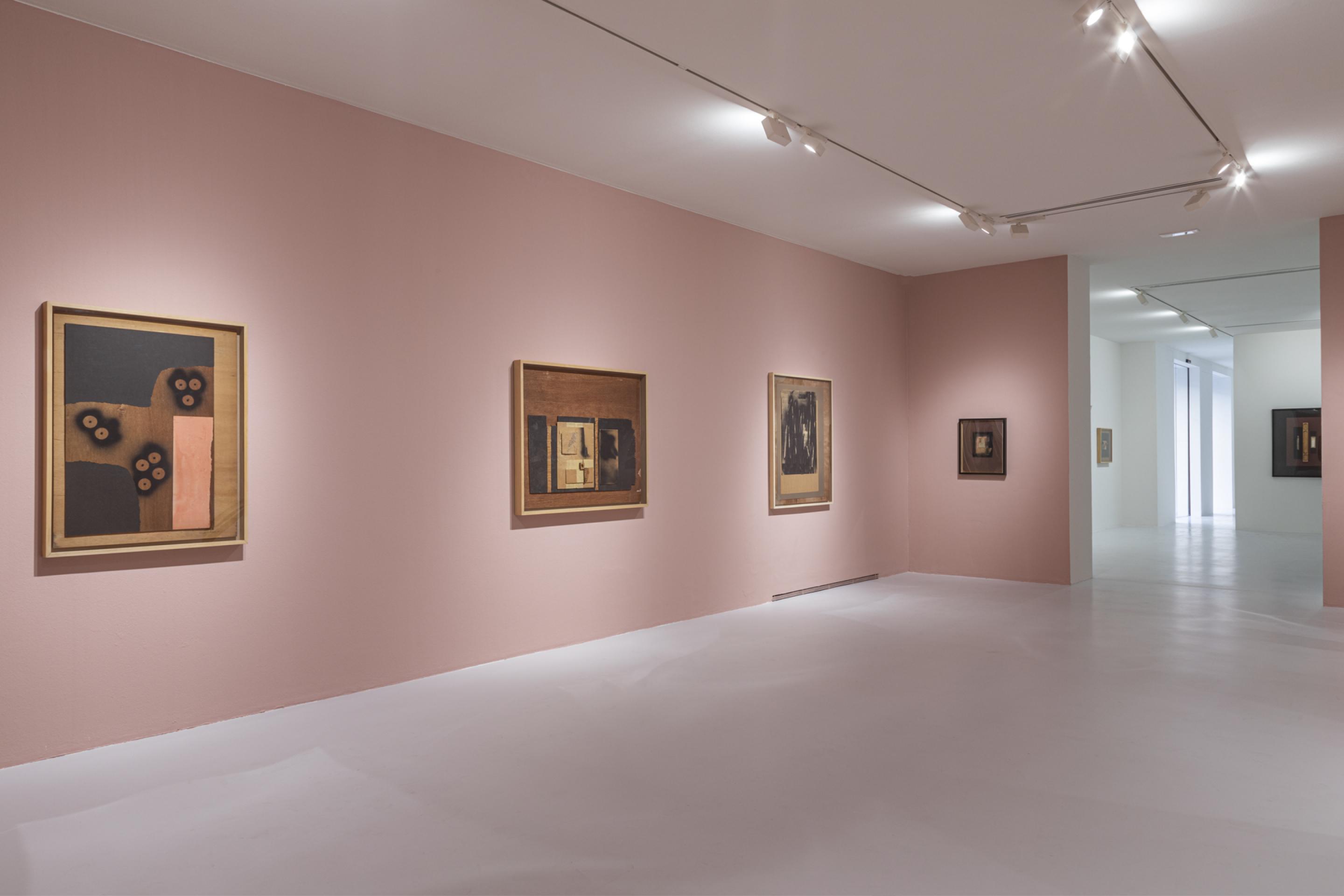 L’esposizione milanese raccoglie un’ampia selezione di collages che l’artista, forte della lezione cubista appresa durante i viaggi in Europa, realizza a partire dagli anni Cinquanta, combinando supporti lignei e cartacei e ottenendo originali esiti prospettici.
