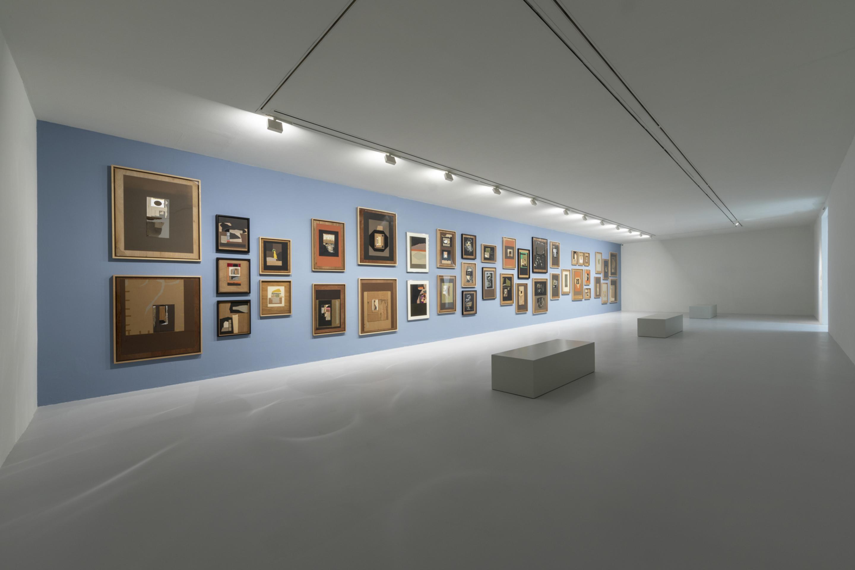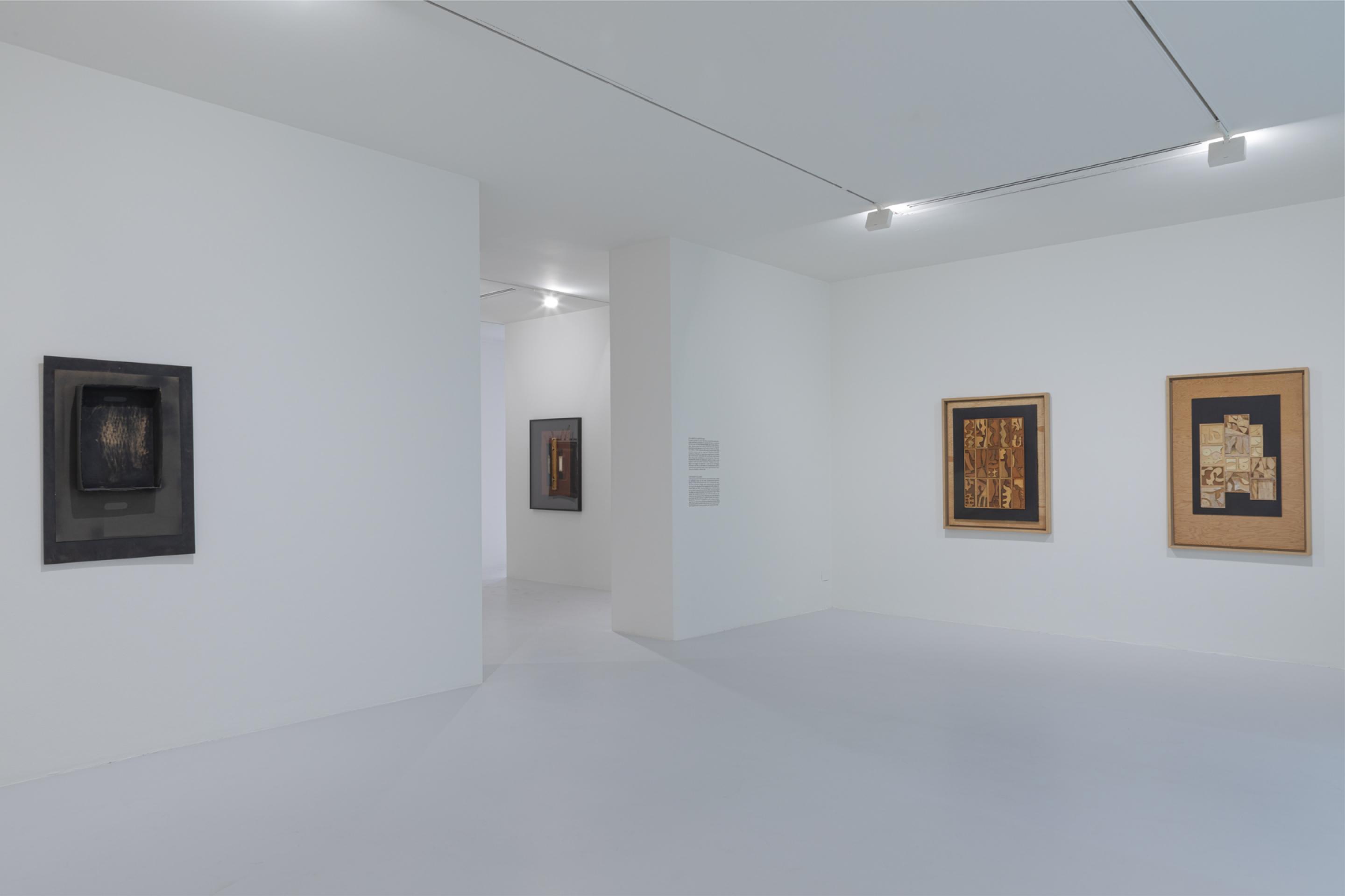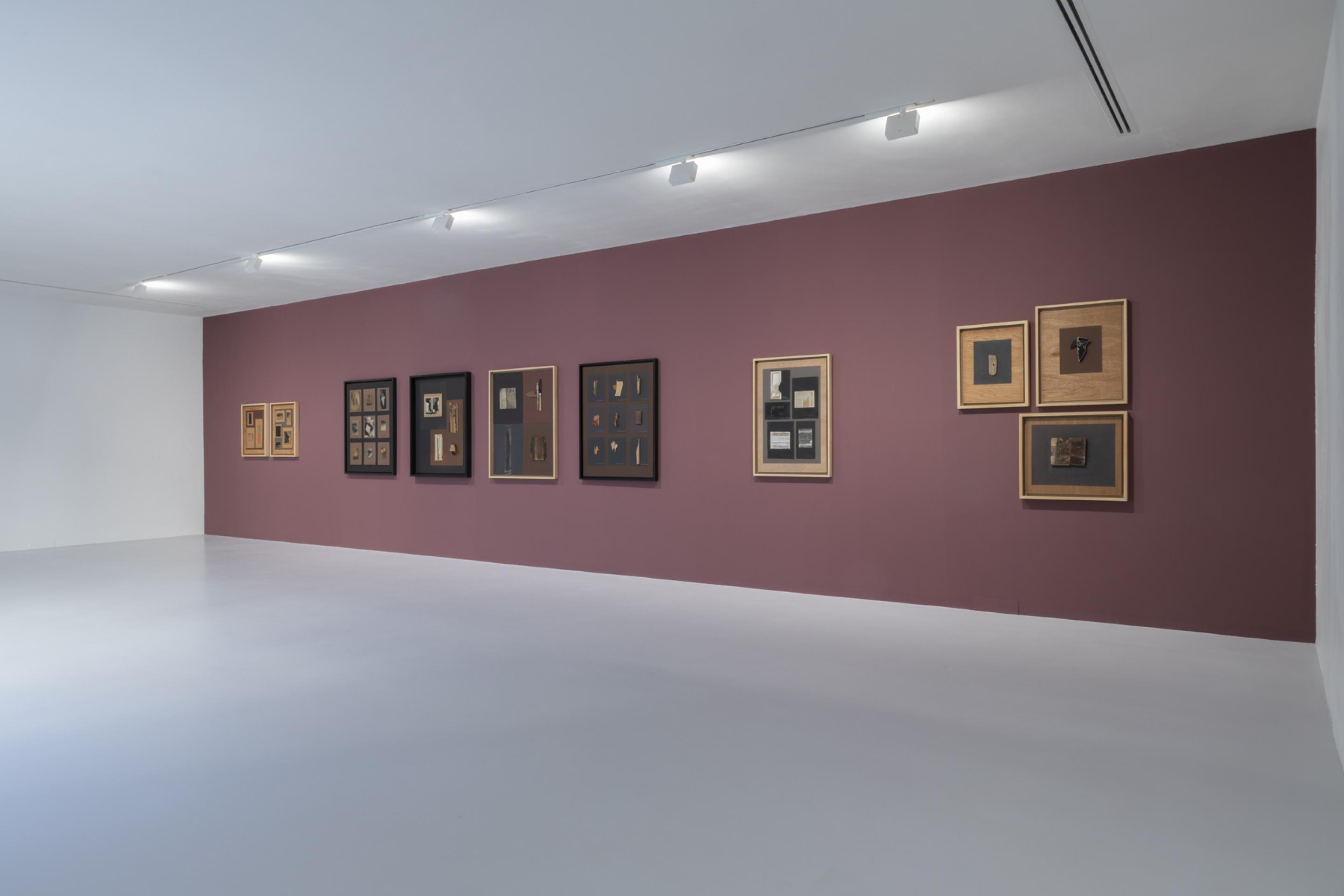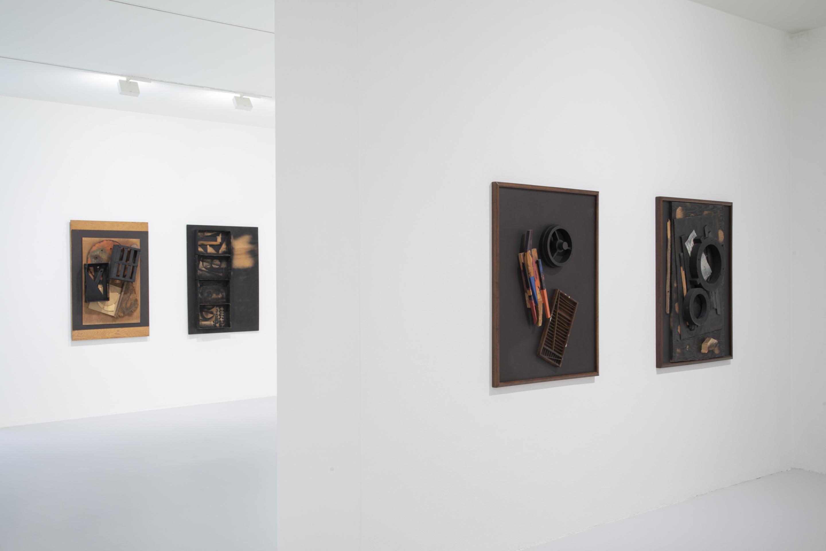 L’esposizione milanese raccoglie un’ampia selezione di collages che l’artista, forte della lezione cubista appresa durante i viaggi in Europa, realizza a partire dagli anni Cinquanta, combinando supporti lignei e cartacei e ottenendo originali esiti prospettici.