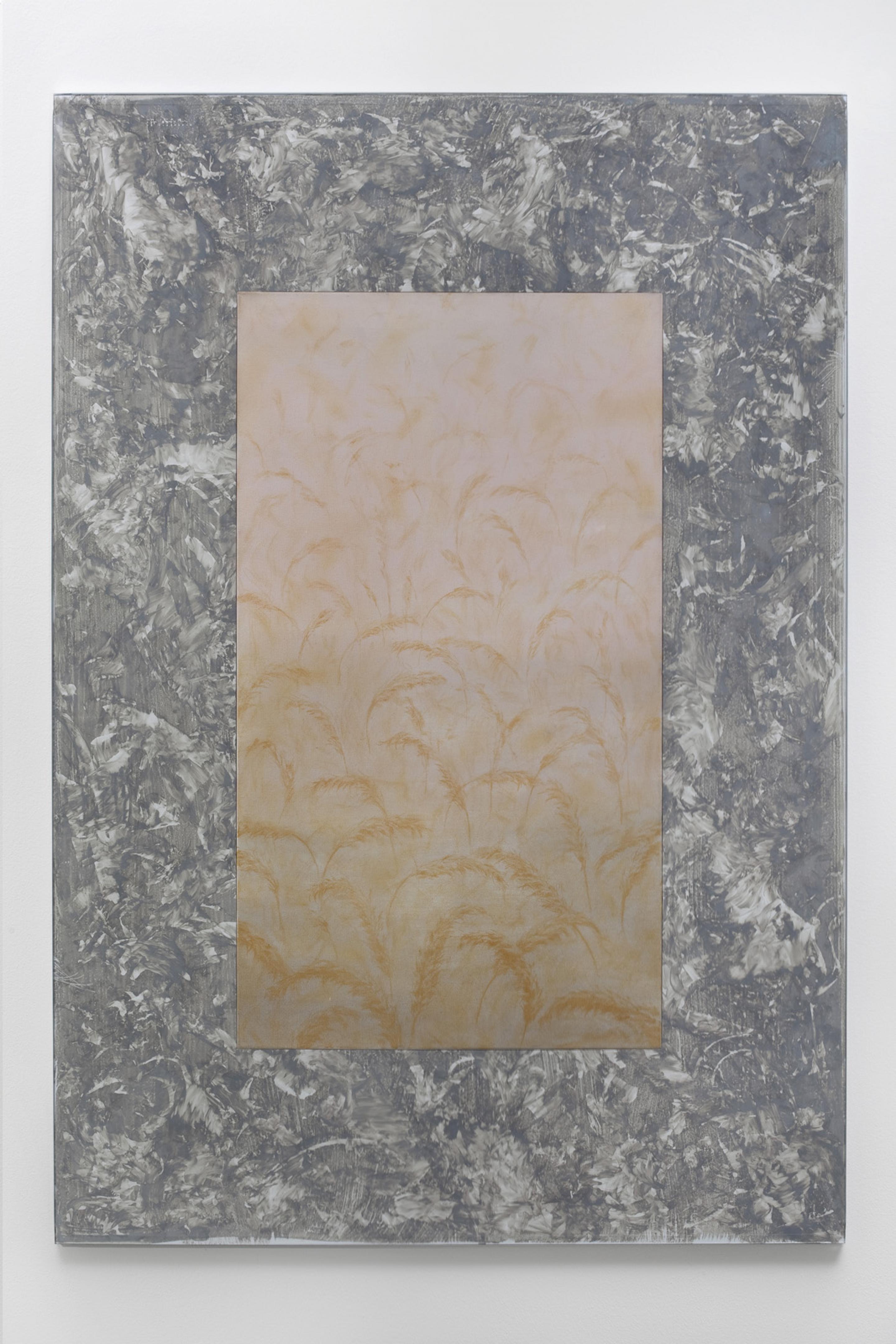 This repertoire of such composite multi-media pictures forms the core of his exhibitions. At Giò Marconi Will Benedict presents a series of new large-scale works. On display are seemingly abstract paintings that merge into bicolored landscapes as well as billowy wheat field vistas, all of which are embedded into the typically painted frames. Also exhibited is the video “I AM A PROBLEM (T.O.D.D.)”, Will Benedict’s take on the migrant crisis, which had premiered at last year’s Berlin Biennial.