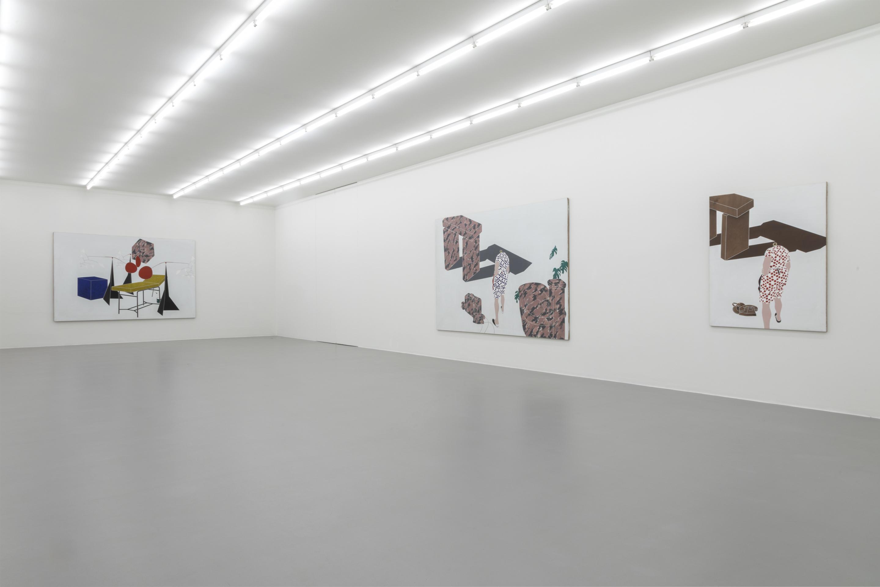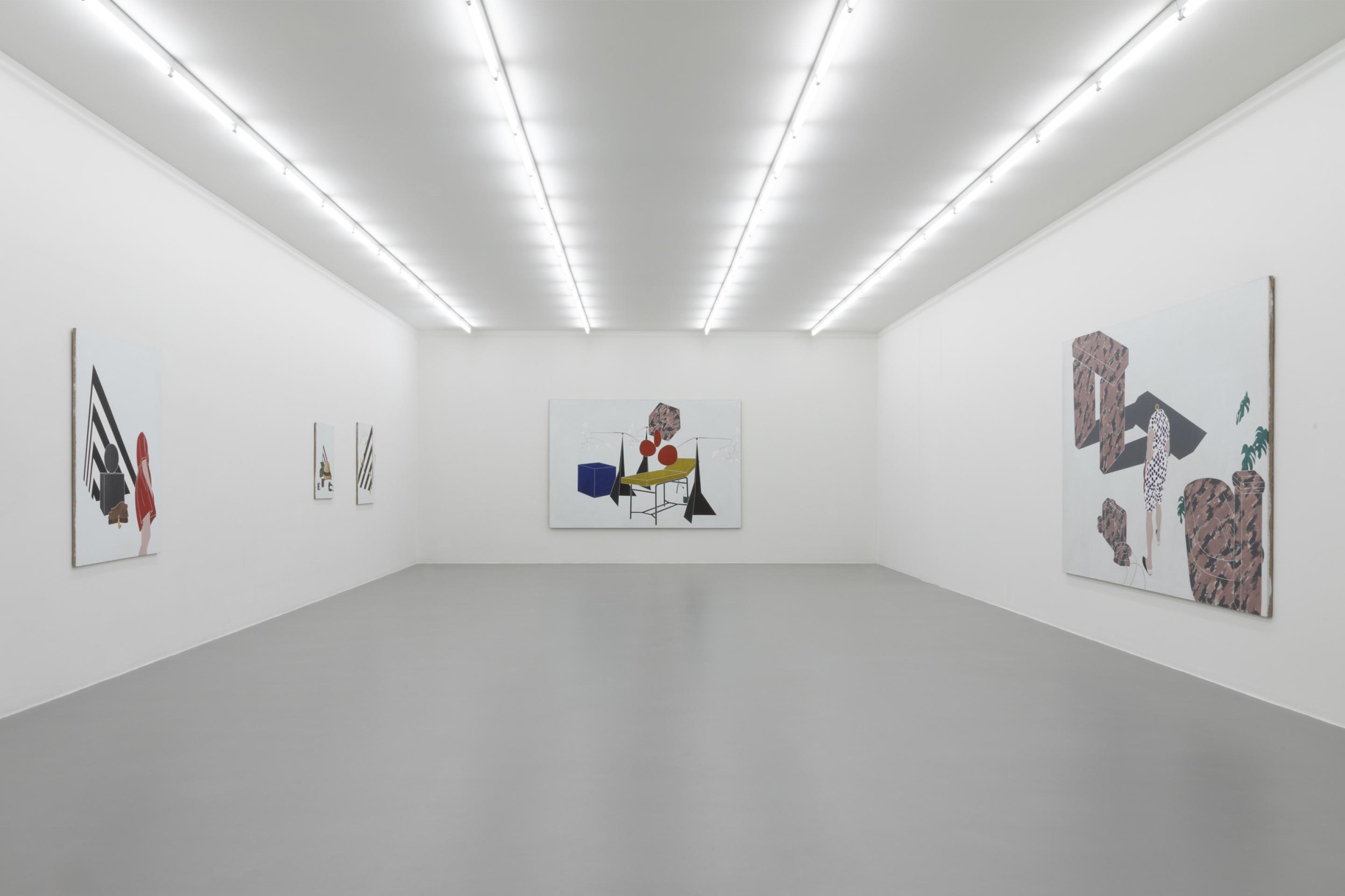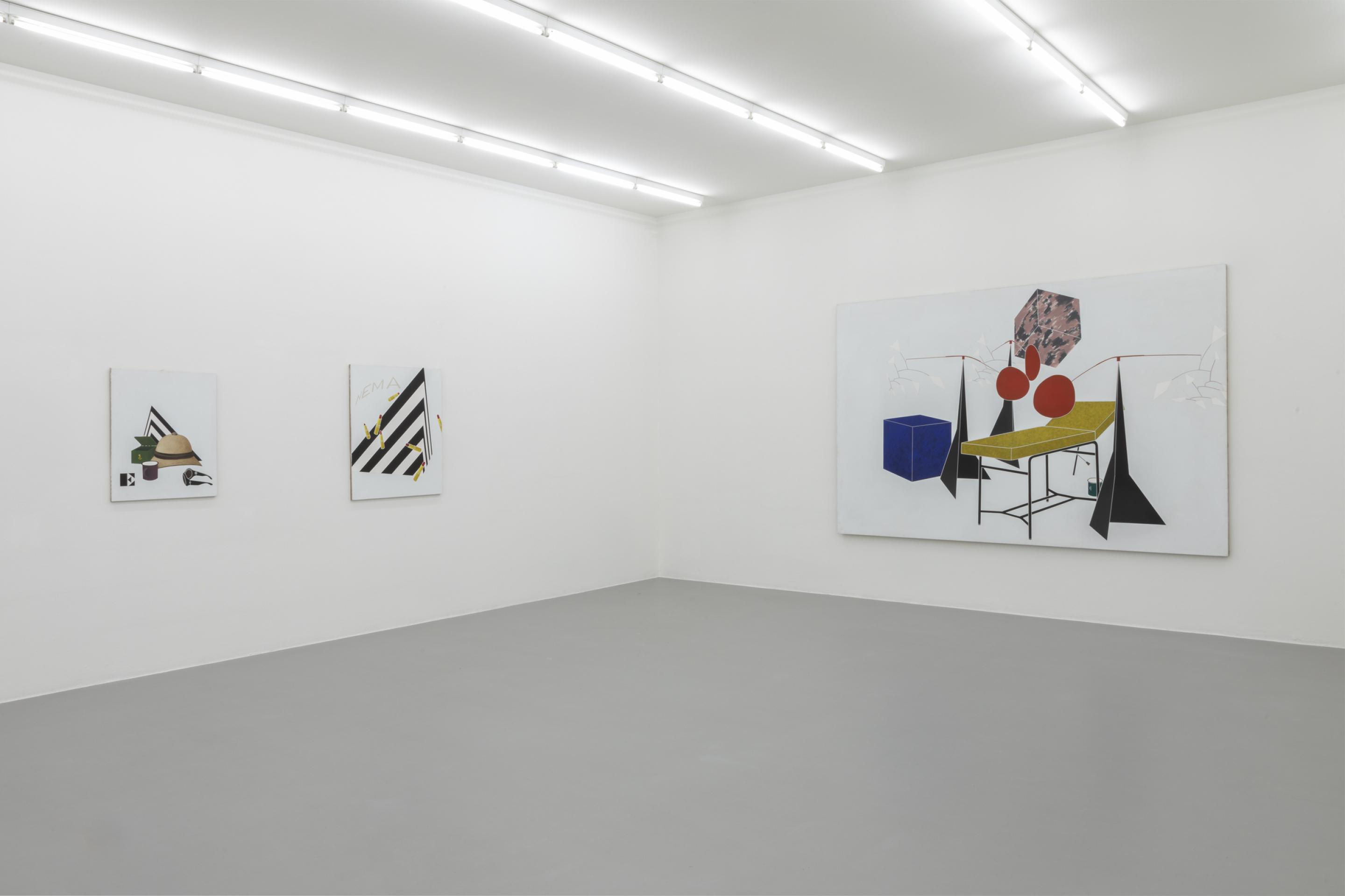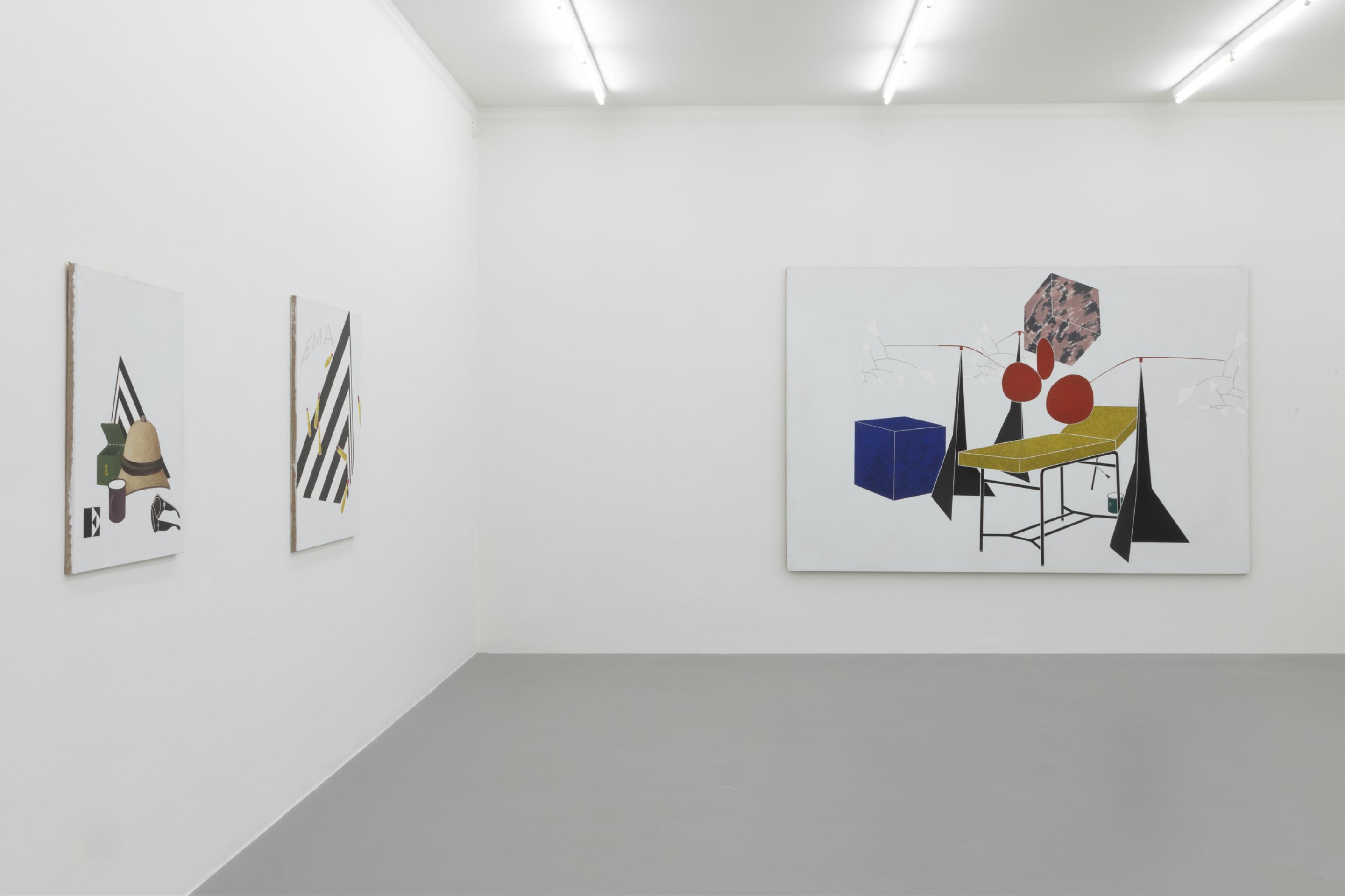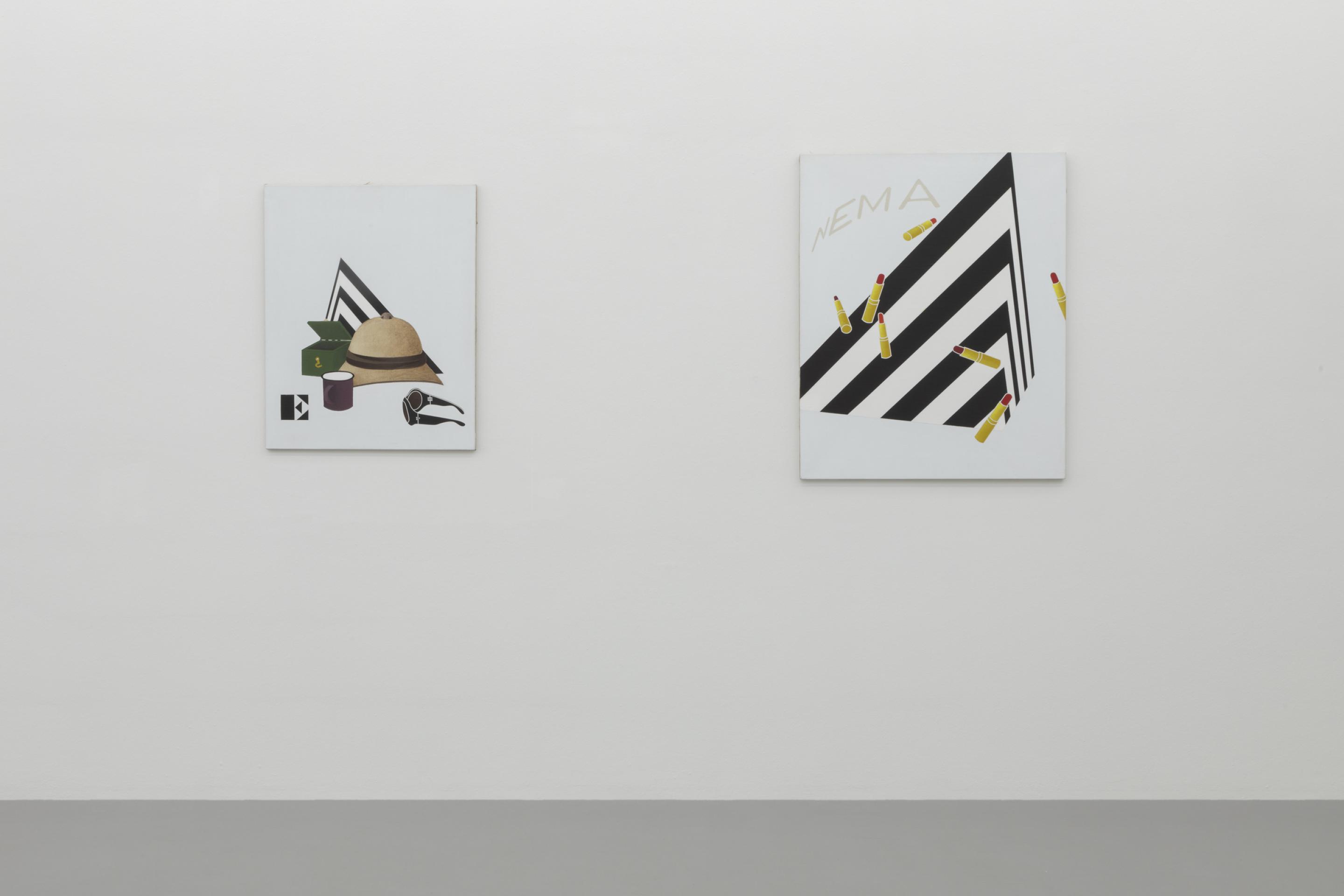 As in previous bodies of work, Tadini uses recurring motives like a black and white striped pyramidal element, a headless standing female figure, a telephone, a beige sun helmet or red lipsticks. Through his choice of objects, Tadini transfers his journey more into the presence. His Italian journey is very much about contemporary everyday life as the phone, the letters (ci)nema, the stylish female outfits, the various design objects or the Calder sculpture clearly suggest.
