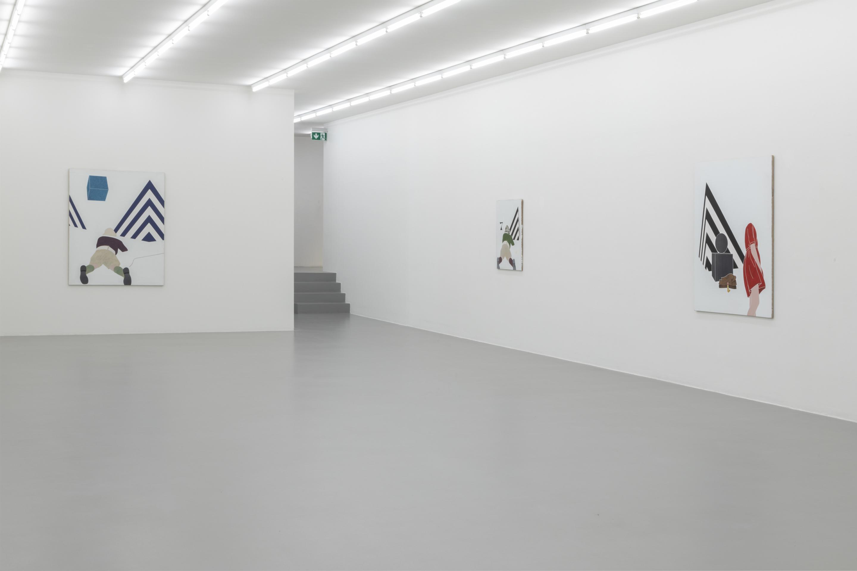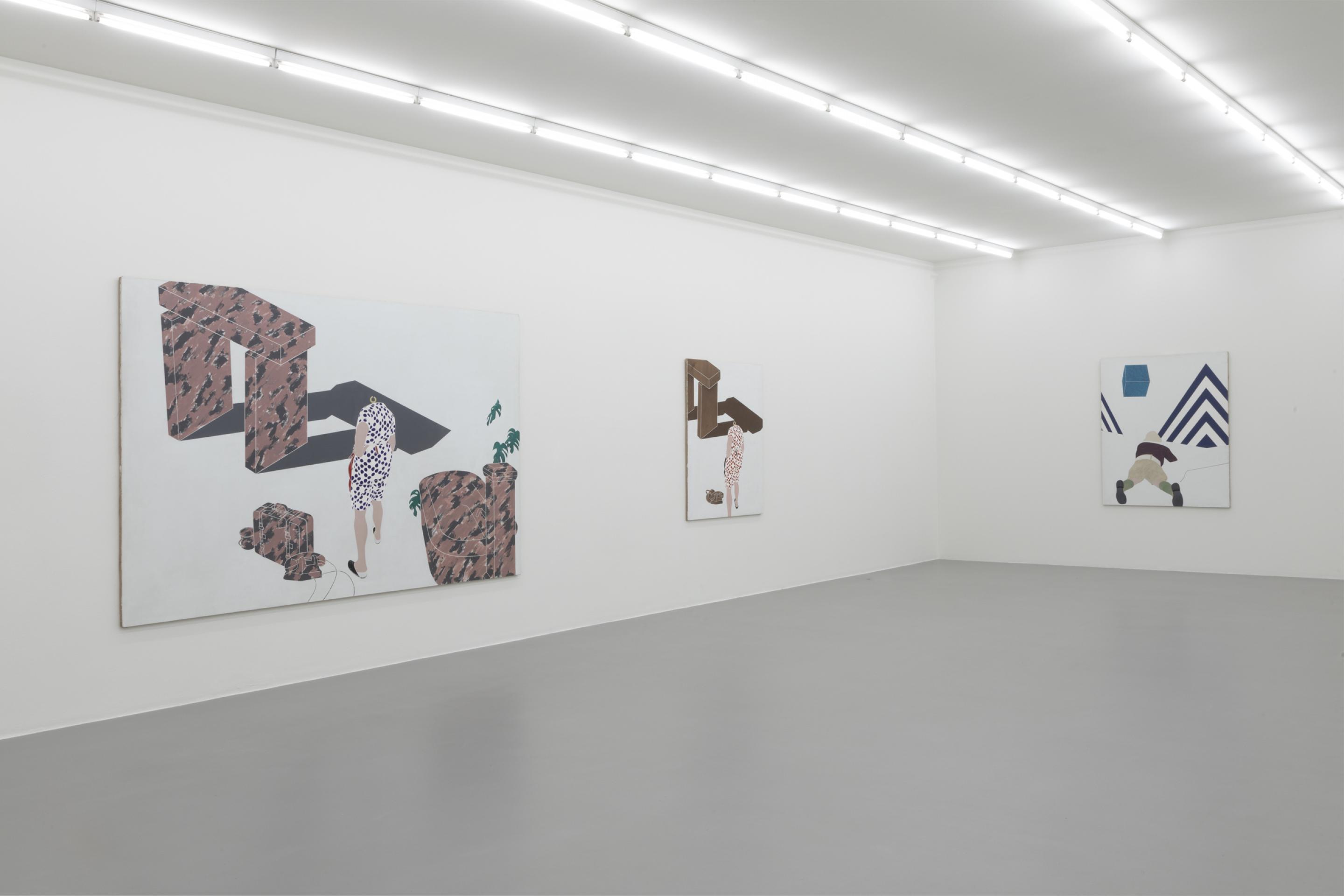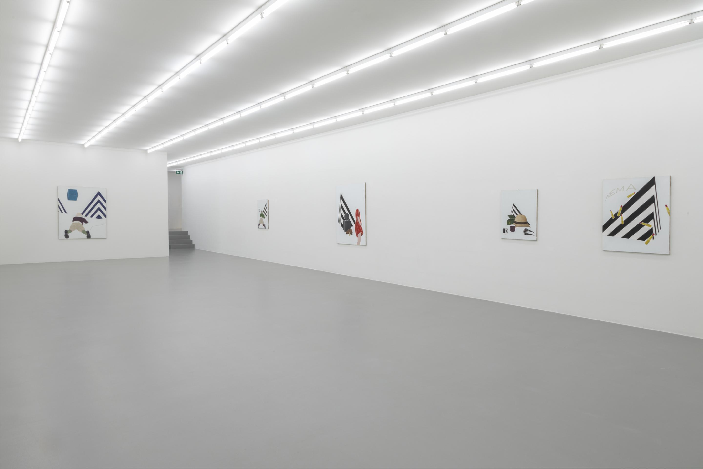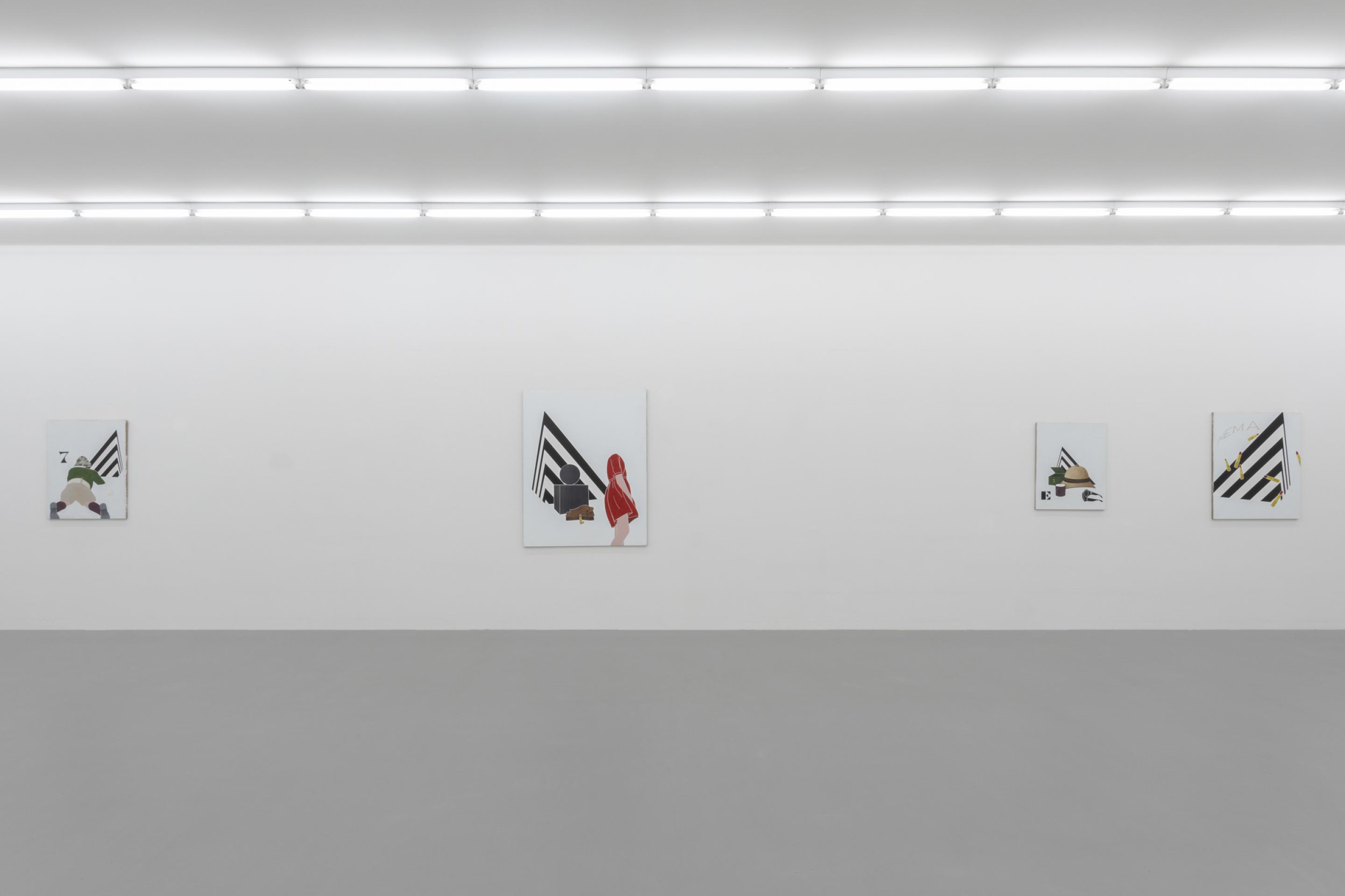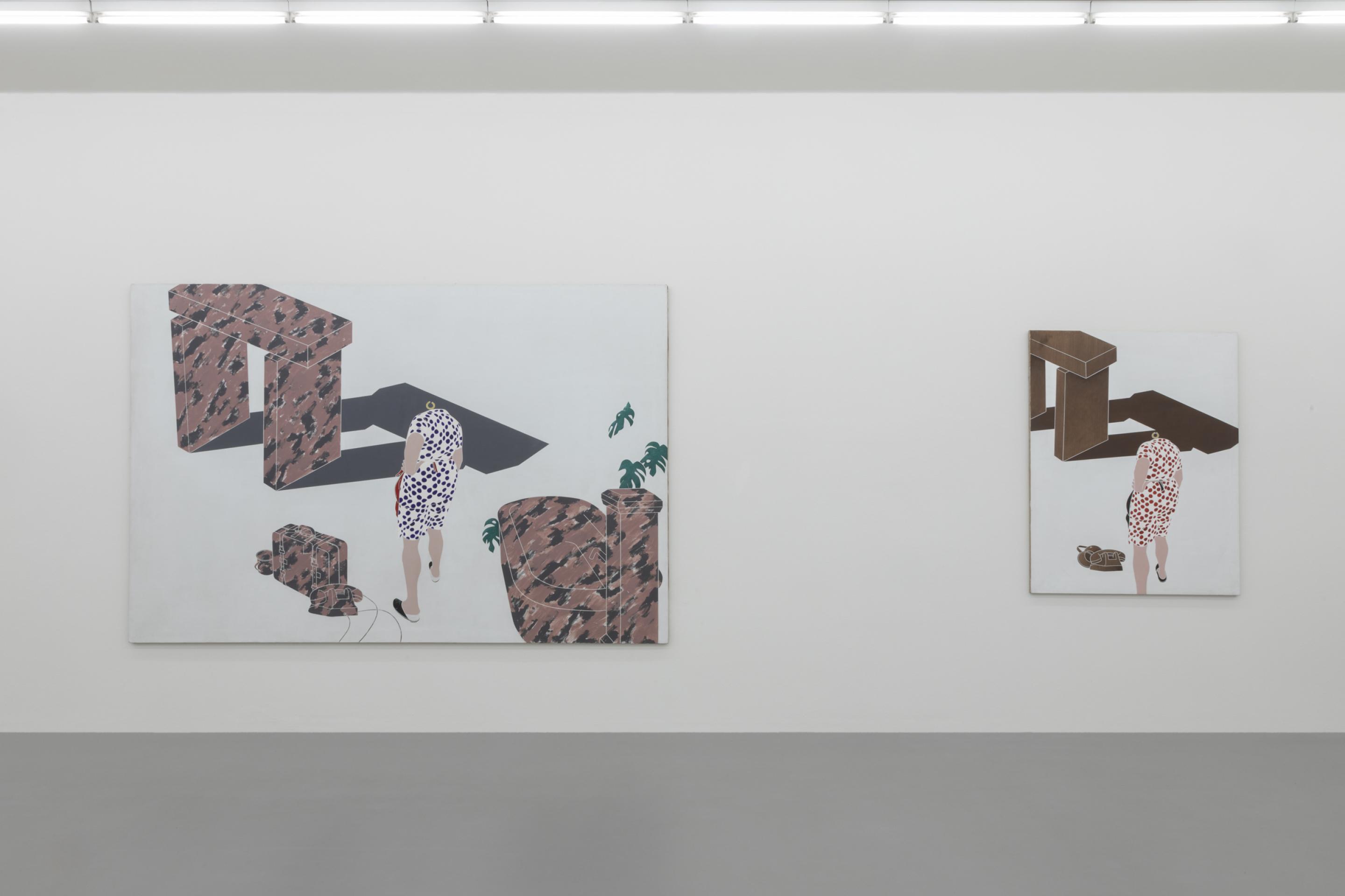 As in previous bodies of work, Tadini uses recurring motives like a black and white striped pyramidal element, a headless standing female figure, a telephone, a beige sun helmet or red lipsticks. Through his choice of objects, Tadini transfers his journey more into the presence. His Italian journey is very much about contemporary everyday life as the phone, the letters (ci)nema, the stylish female outfits, the various design objects or the Calder sculpture clearly suggest.