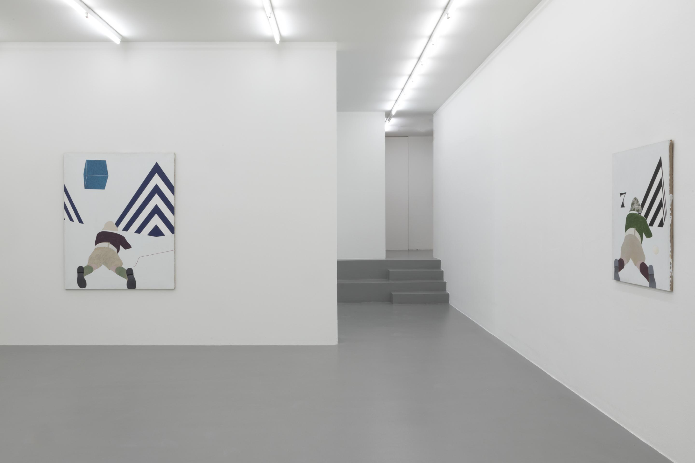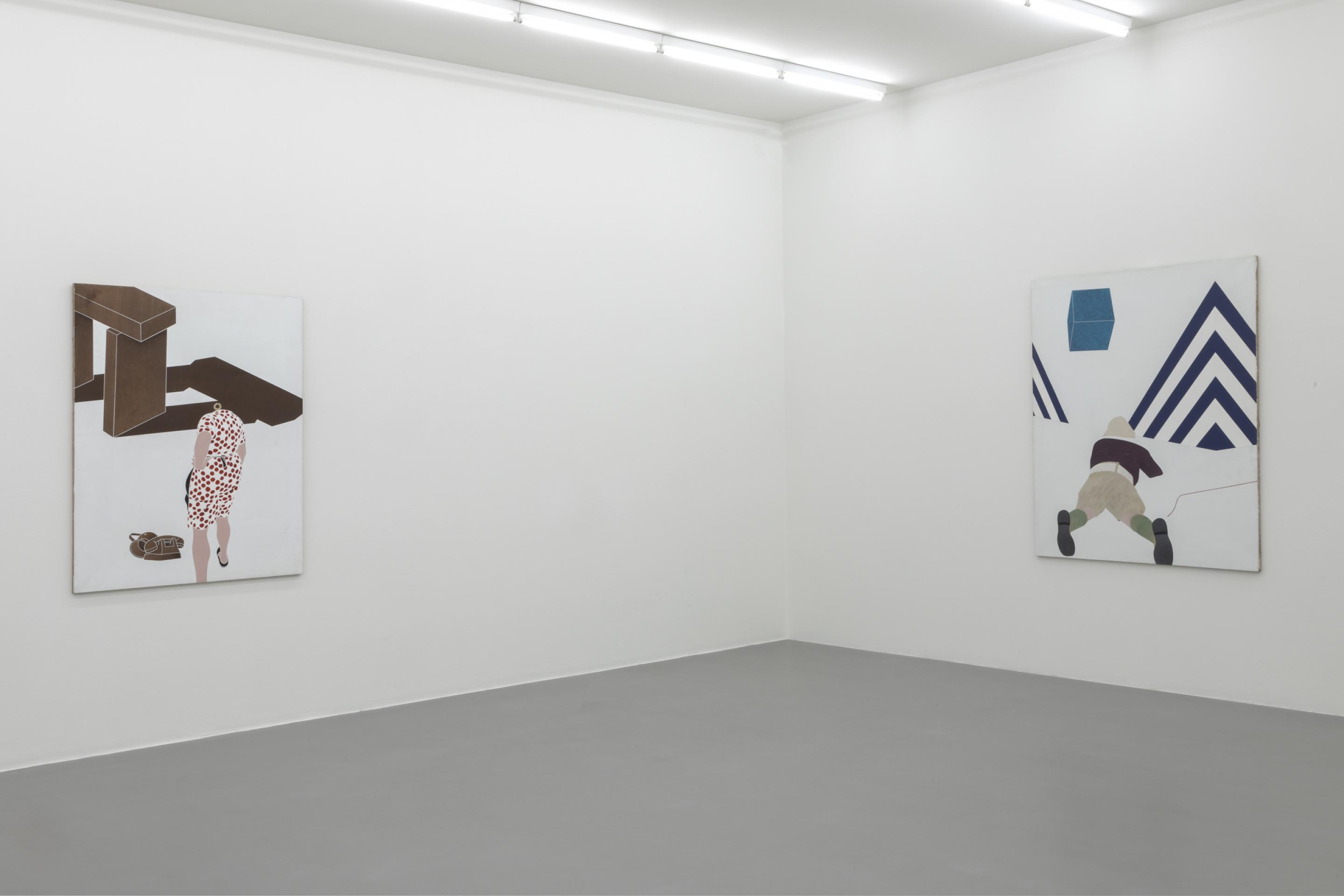 In one of the large scale paintings from the Viaggio series, Tadini forthrightly quotes a well-known Johann Heinrich Wilhelm Tischbein graphic Goethe am Fenster der römischen Wohnung am Corso depicting a standing Goethe from behind who is gazing out of his window. Tadini’s version shows both the open and closed windows and endows the headless standing figure with the exact same set of clothes -long socks, a pair of knickerbockers and shirt- as in the original.