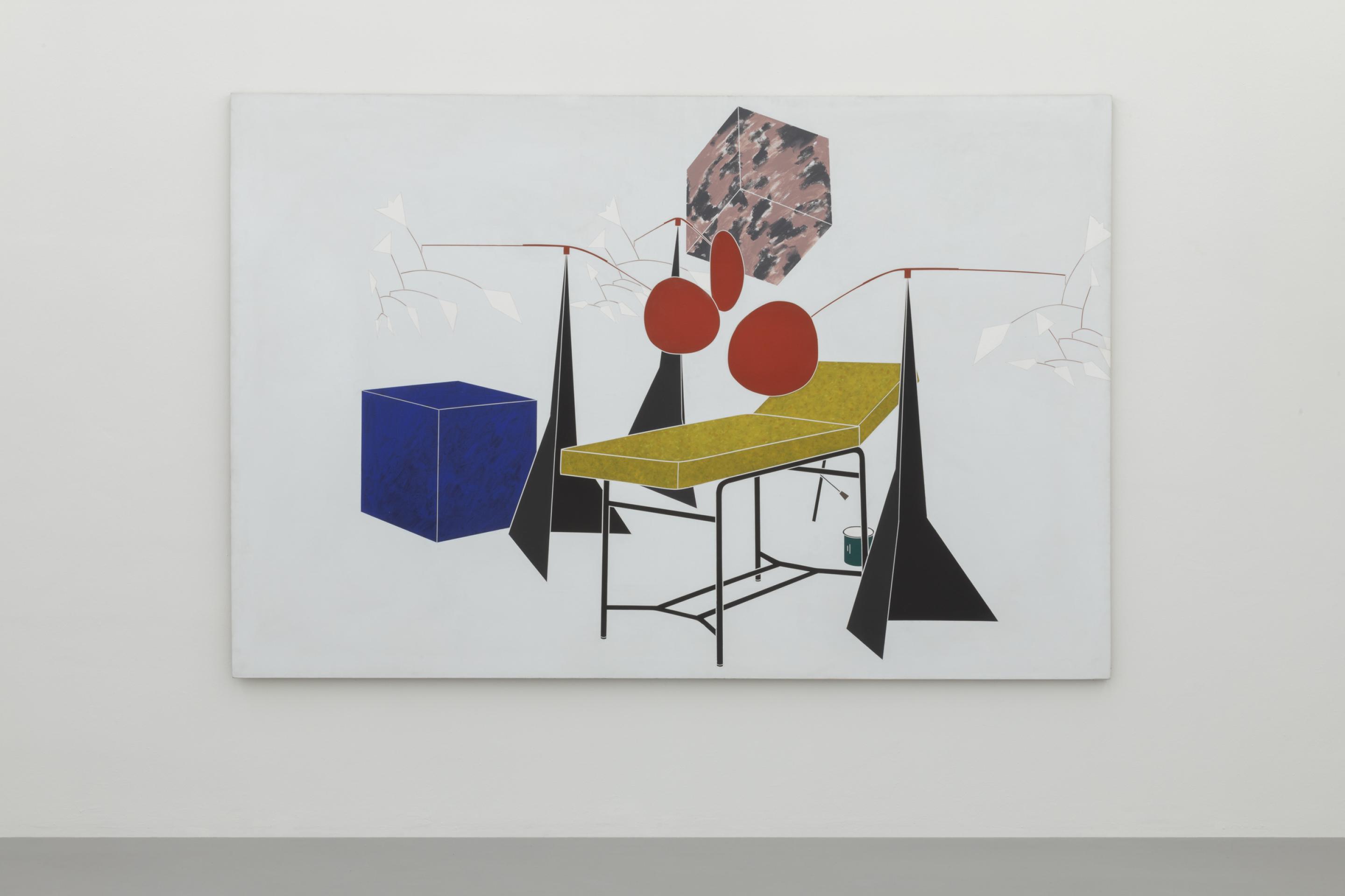 As in Tadini’s previous bodies of work, he does not depict stories but paints a selection of disconnected everyday objects onto his canvases: from a telephone, a cup, a suitcase or a fountain to recurring design objects, artworks and geometrical forms. As Francesco Guzzetti notes in the just published The Reality of the Image 1968-1972: “Like still lives, Tadini’s paintings propose nothing more than the pure object, rendered in the denoting quality of paint and in the internal arrangement of the space of the painting”.