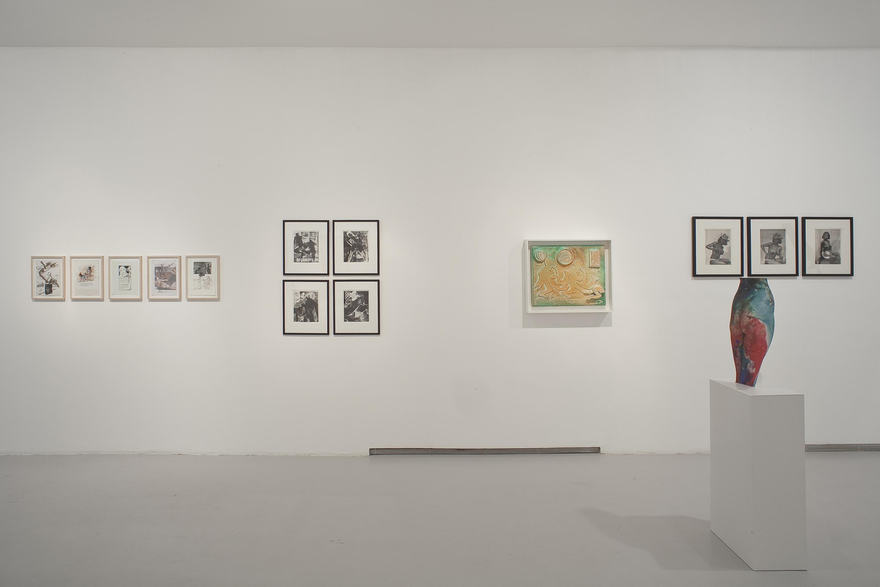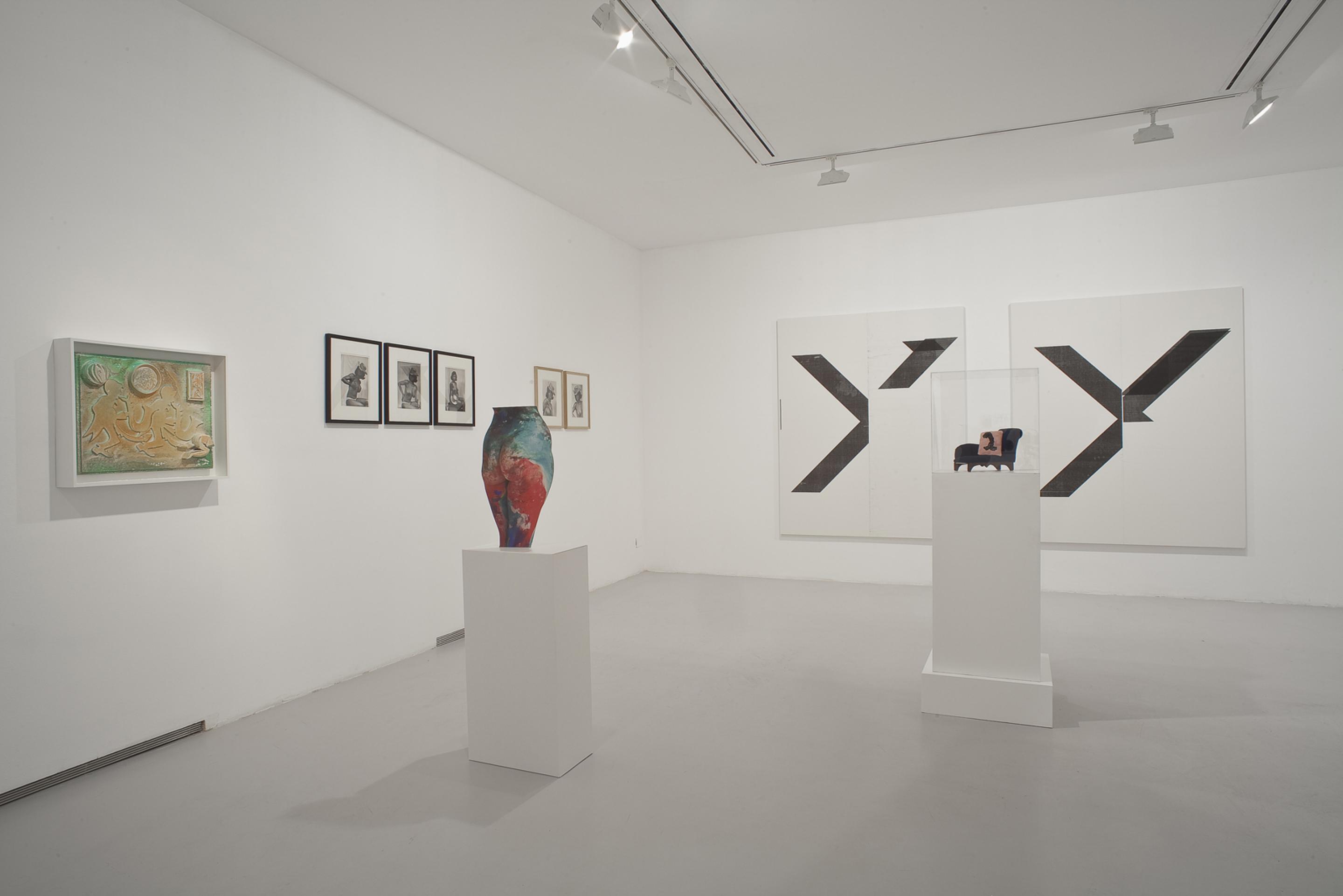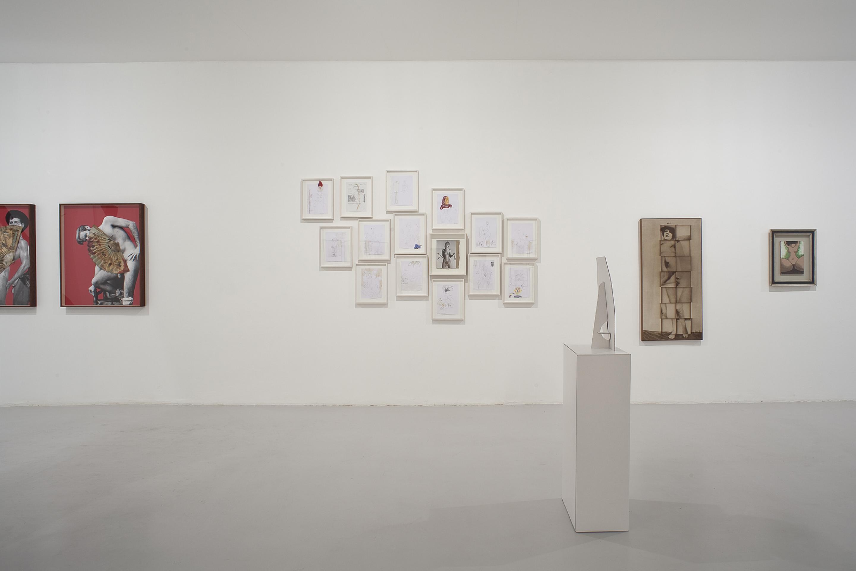 Nei disegni e nei collages di Nader Ahriman (Shiraz 1964) le astrazioni filosofiche di matrice idealista prendono forma attraverso l'intervento grafico dell'artista. Cinema e antichità sono filtrati in chiave erotica, fondendo estetica e contenuto. Nel piccolo disegno a matita del 1967 uno degli elementi ricorrenti della produzione di Enrico Baj (Milano 1924 - Vergiate 2003) assume delle ironiche sembianze falliche: in quegli anni l'artista ha frequentemente utilizzato fiocchi, cordoni e medaglie come soggetti parodistici dei suoi 'ritratti'. Bruno Di Bello (Torre Del Greco 1938) partecipa alla collettiva con una "Variazione su una foto di Man Ray" realizzata nel 1975 su tela fotografica. Attraverso la scomposizione dell'immagine di Kiki, musa del maestro, Di Bello rilegge l'esperienza delle avanguardie storiche sviluppando un'idea dell'arte come riflessione sulla sua storia.