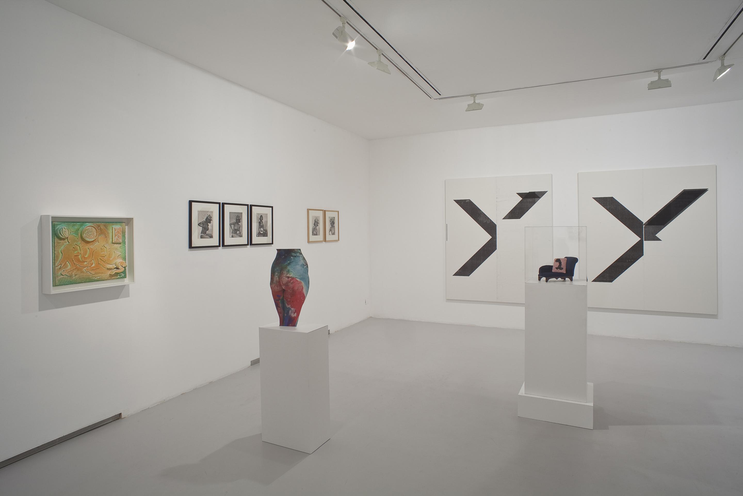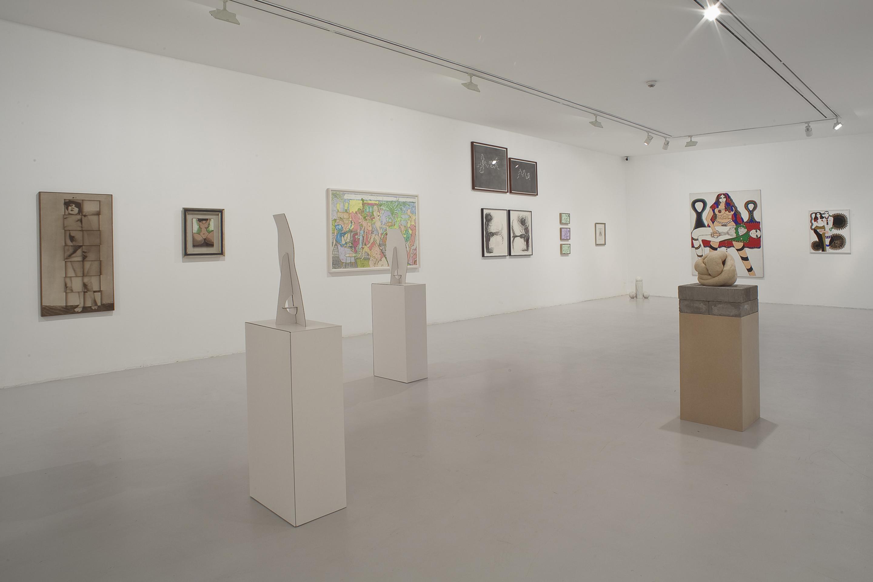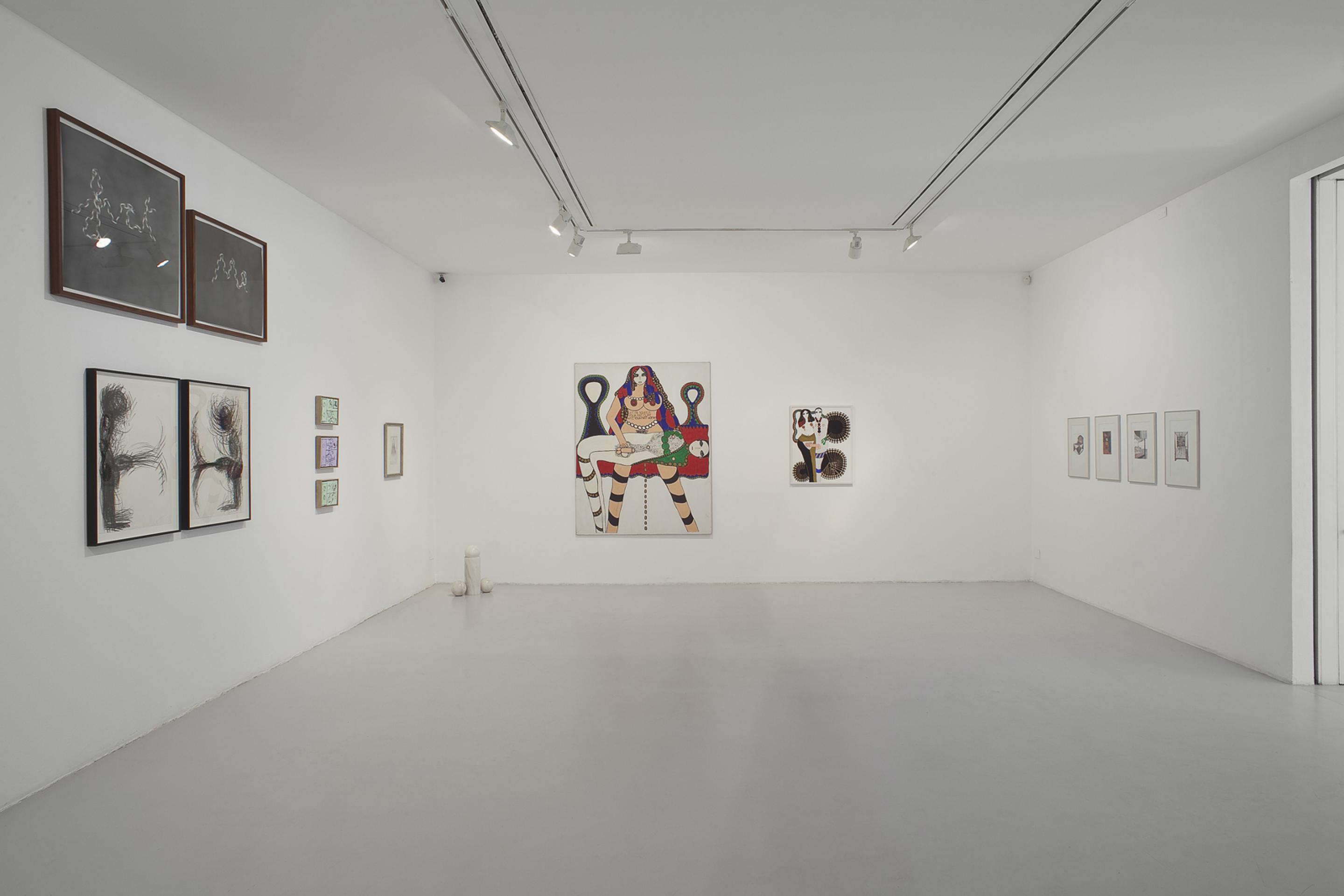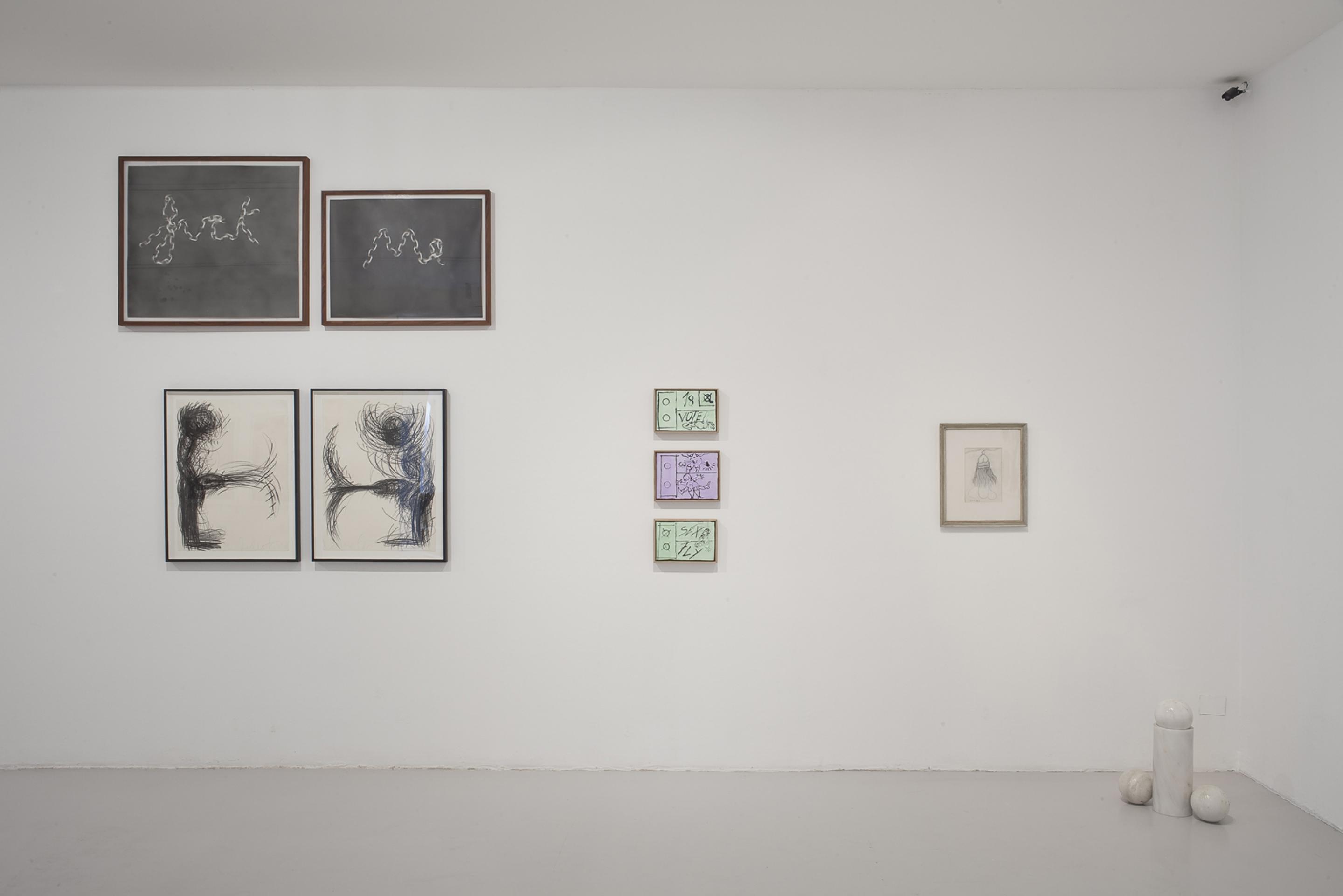 Nei disegni e nei collages di Nader Ahriman (Shiraz 1964) le astrazioni filosofiche di matrice idealista prendono forma attraverso l'intervento grafico dell'artista. Cinema e antichità sono filtrati in chiave erotica, fondendo estetica e contenuto. Nel piccolo disegno a matita del 1967 uno degli elementi ricorrenti della produzione di Enrico Baj (Milano 1924 - Vergiate 2003) assume delle ironiche sembianze falliche: in quegli anni l'artista ha frequentemente utilizzato fiocchi, cordoni e medaglie come soggetti parodistici dei suoi 'ritratti'. Bruno Di Bello (Torre Del Greco 1938) partecipa alla collettiva con una "Variazione su una foto di Man Ray" realizzata nel 1975 su tela fotografica. Attraverso la scomposizione dell'immagine di Kiki, musa del maestro, Di Bello rilegge l'esperienza delle avanguardie storiche sviluppando un'idea dell'arte come riflessione sulla sua storia.