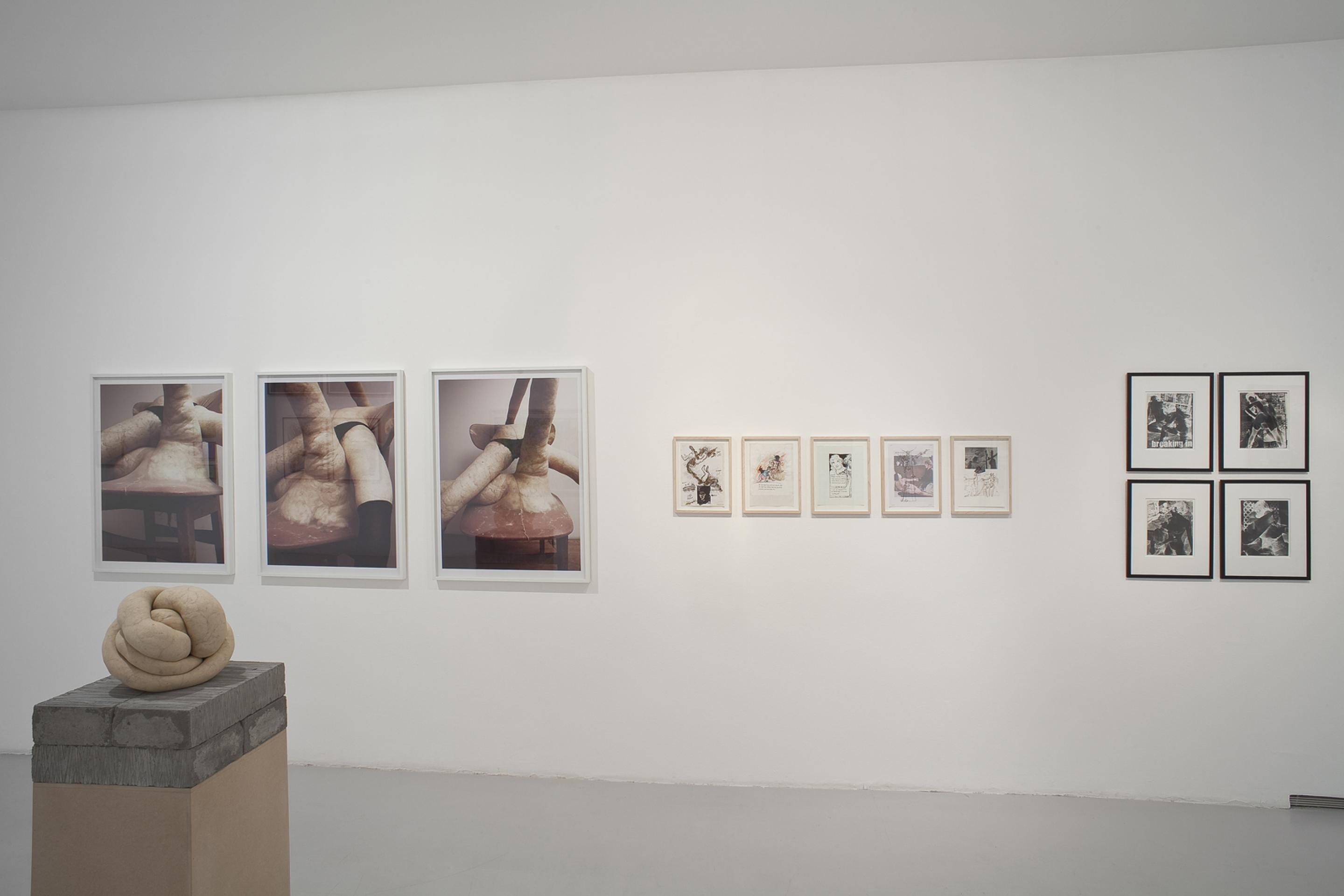 The genital metamorphosis of Sarah Lucas (London 1962) is shown both in one of her trademark stockinged “NUD” sculptures and in 3 of her prints.